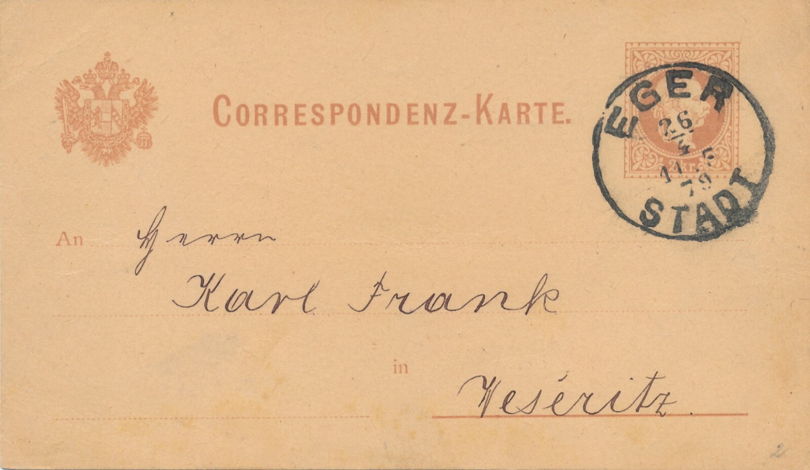 2 Kreuzer - Ganzsachen - Karte 1879 aus Eger Stadt (10161)
