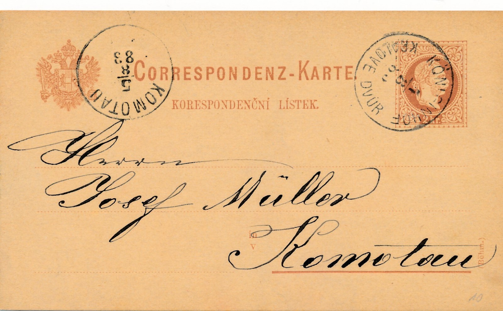 2 Kreuzer - Ganzsachen - Karte 1883 aus Kralove (13583)