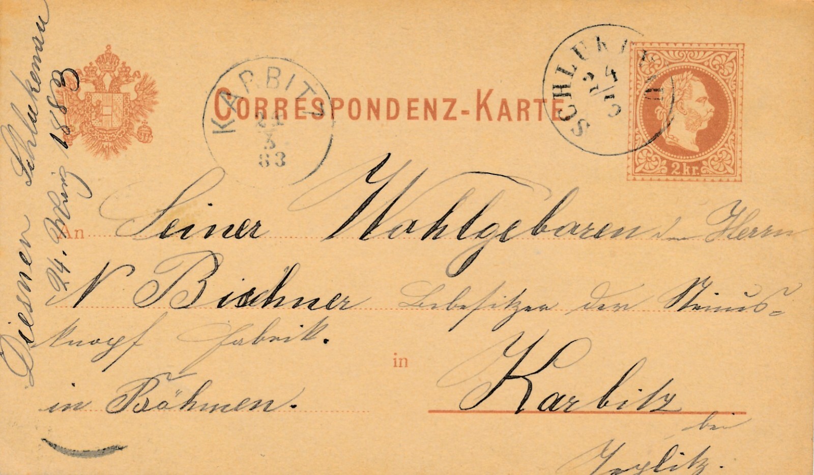 2 Kreuzer - Ganzsachen - Karte 1883 aus Schluckenau (13600)