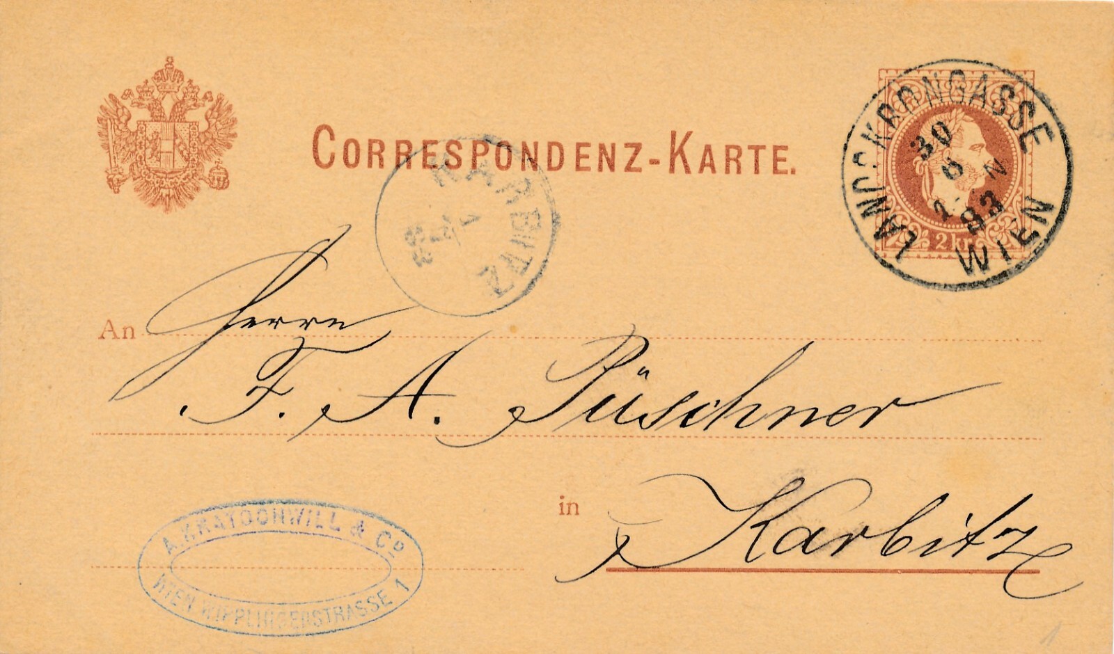 2 Kreuzer - Ganzsachen - Karte 1883 aus Wien Landskorngasse (13564)