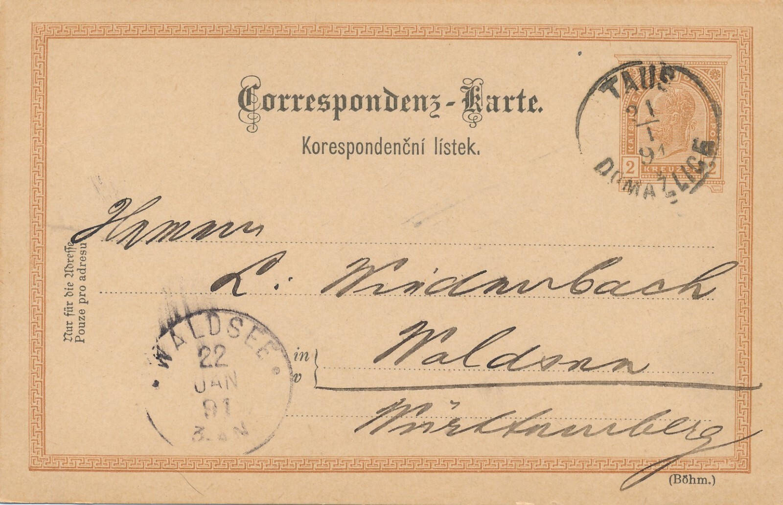 2 Kreuzer Ganzsachen - Karte 1891 aus Taus Domazlice (10518)