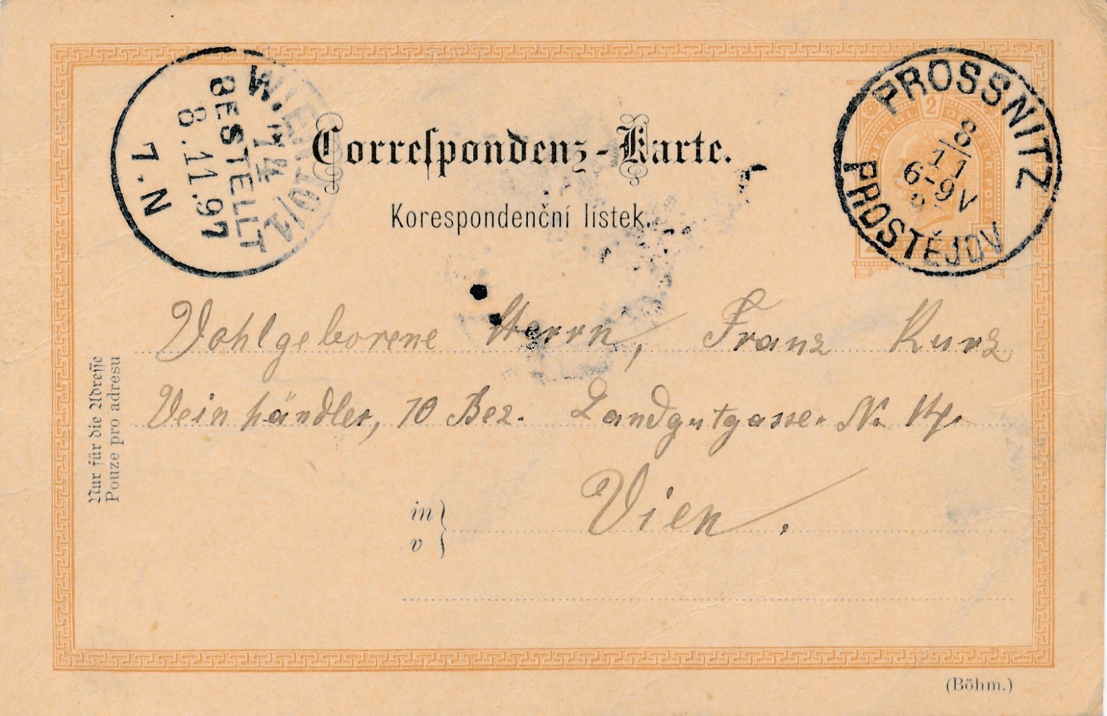 2 Kreuzer Ganzsachen - Karte aus Prossnitz Prostejov (16363)