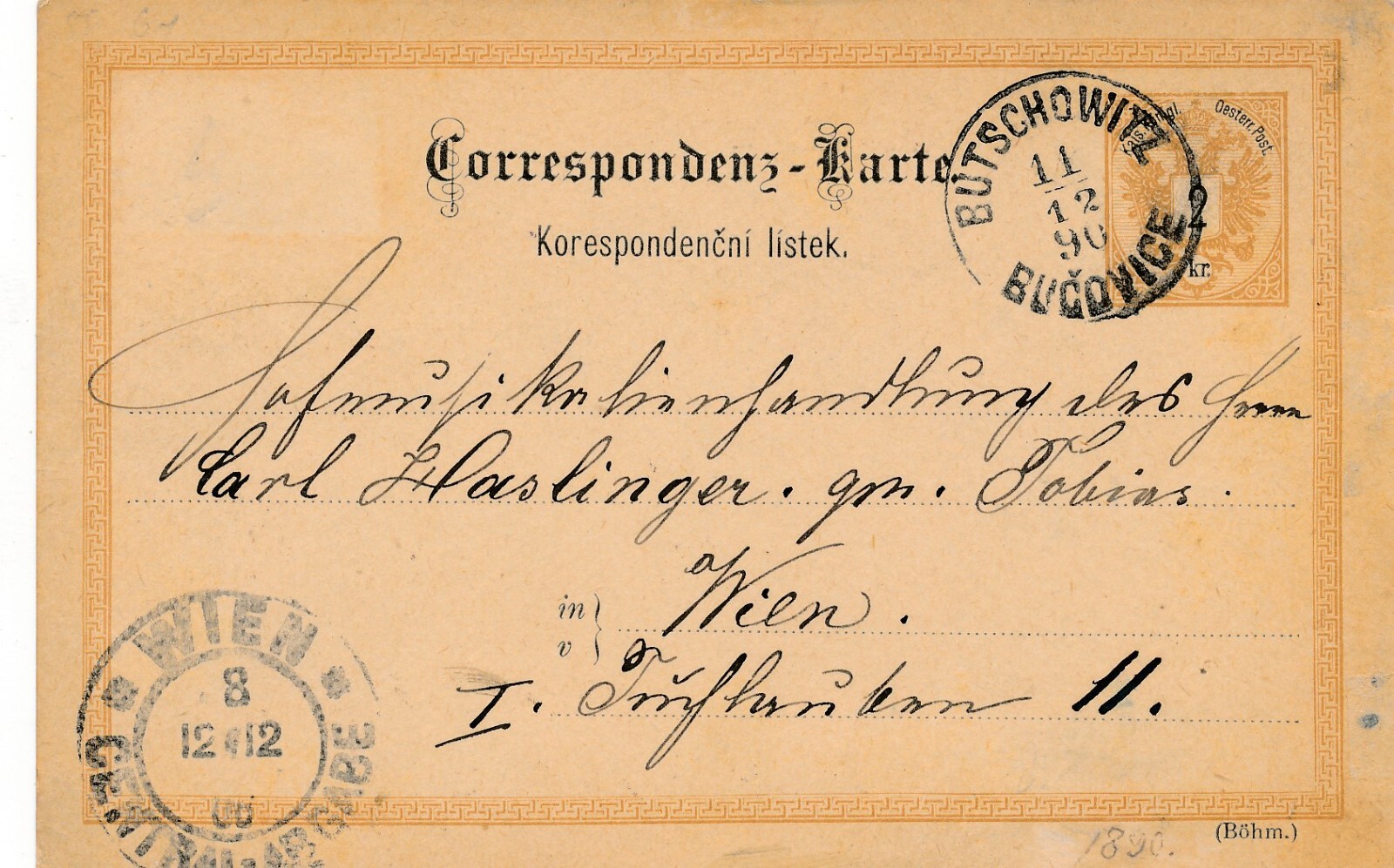 2 Kreuzer Ganzsachen - Karte (Böhm) 1890 aus Butschowitz (11602)