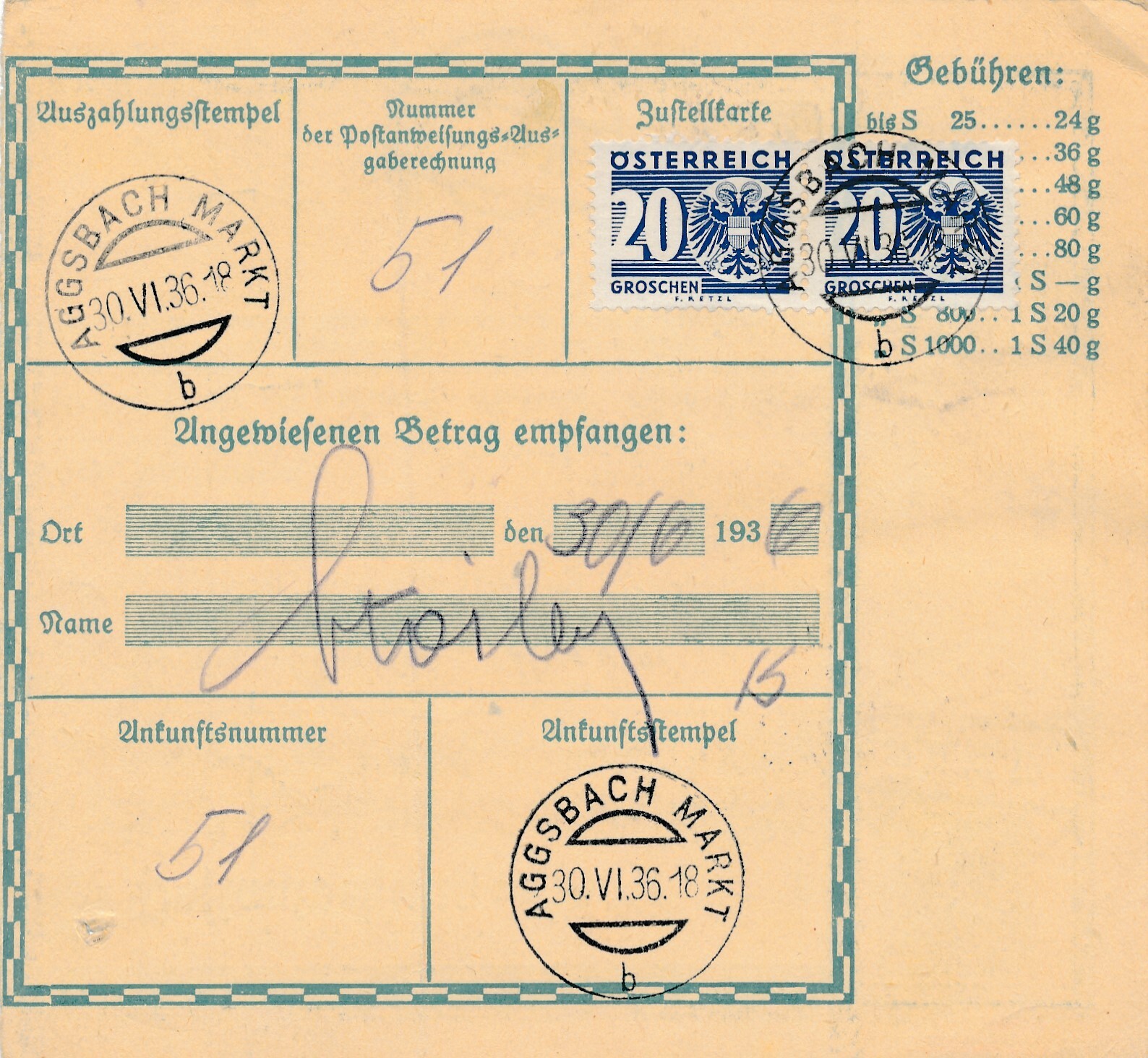 24 Gr. Postanweisung 1936 aus Wien nach Aggsbach + Trachten Marken (10399)