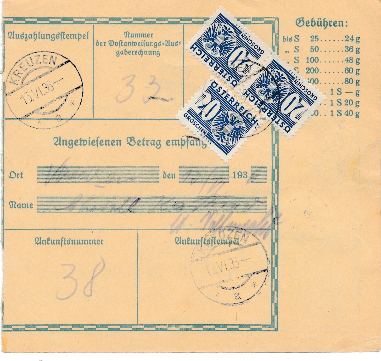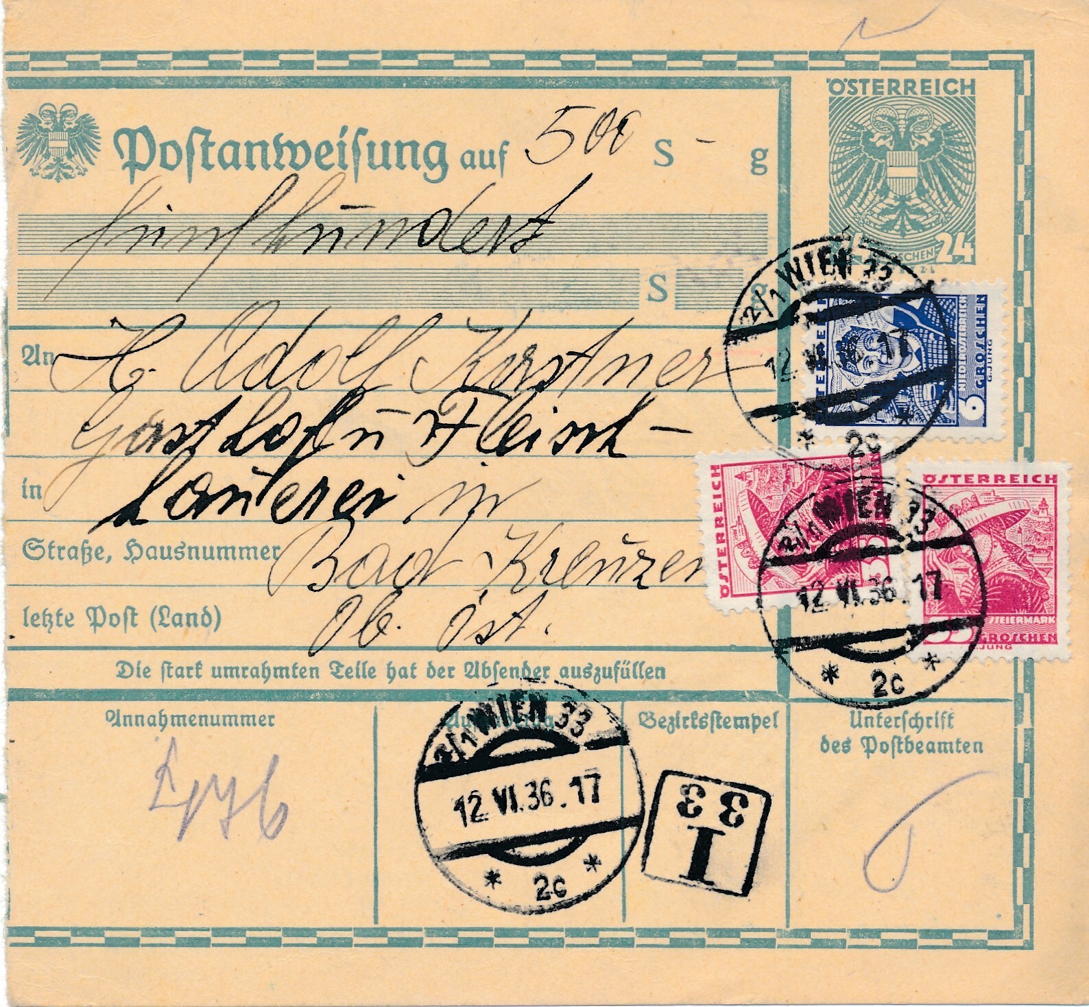 24 Gr. Postanweisung 1936 aus Wien nach Bad Kreuzen + Trachten Marken (10405)