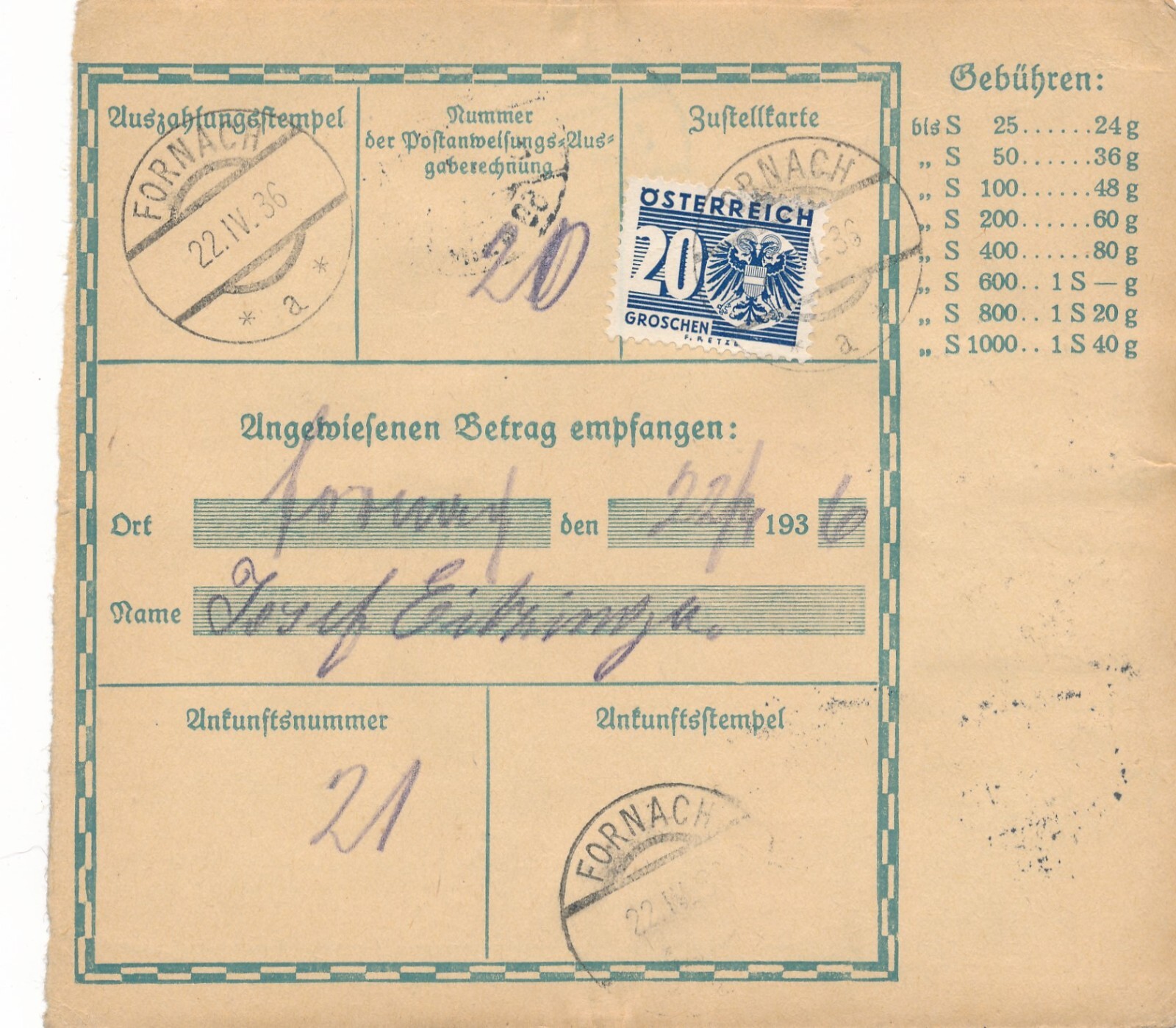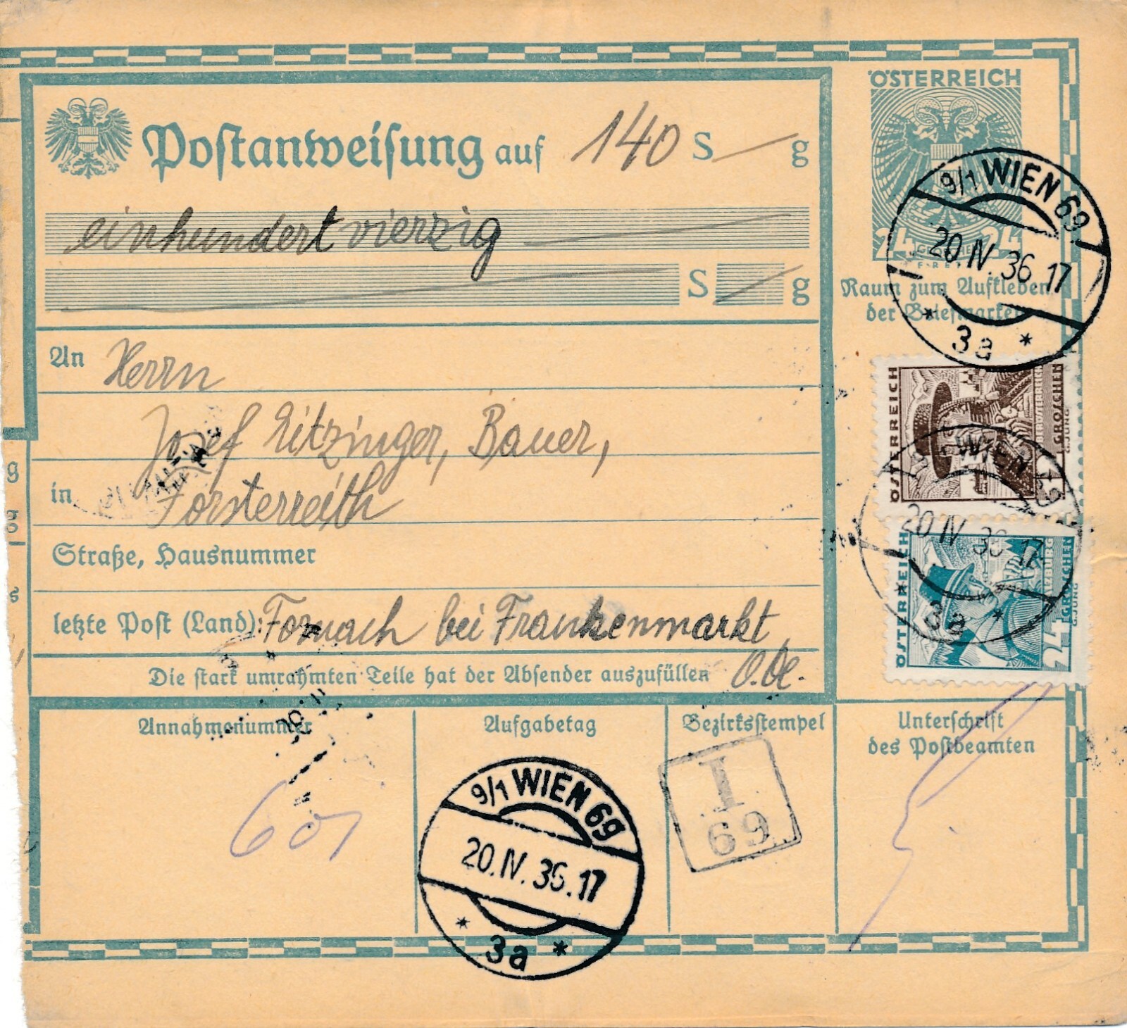24 Gr. Postanweisung 1936 aus Wien nach Fornach + Trachten Marken (10423)