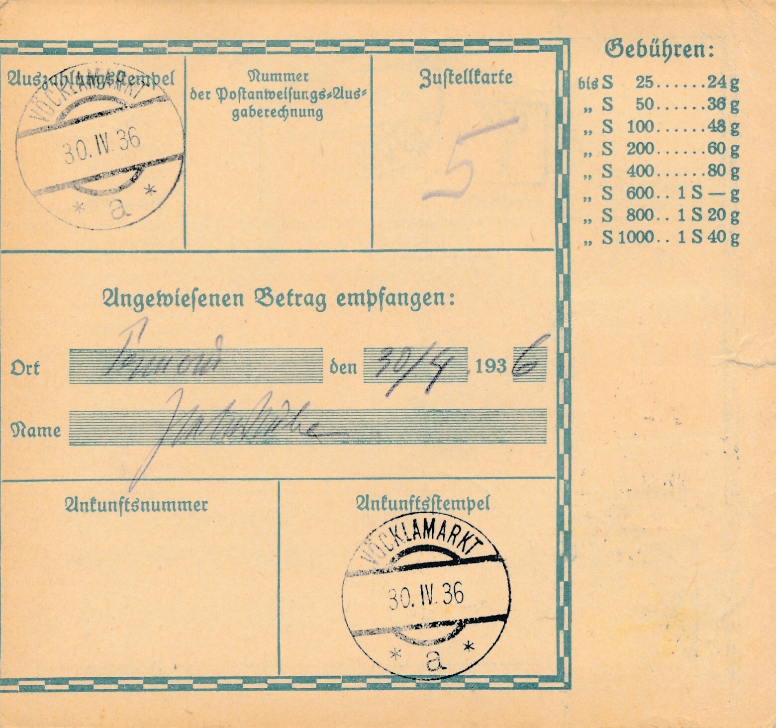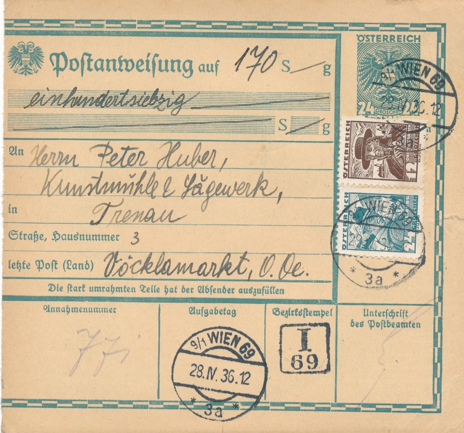 24 Gr. Postanweisung 1936 aus Wien nach Vöcklamarkt + Trachten Marken (10419)