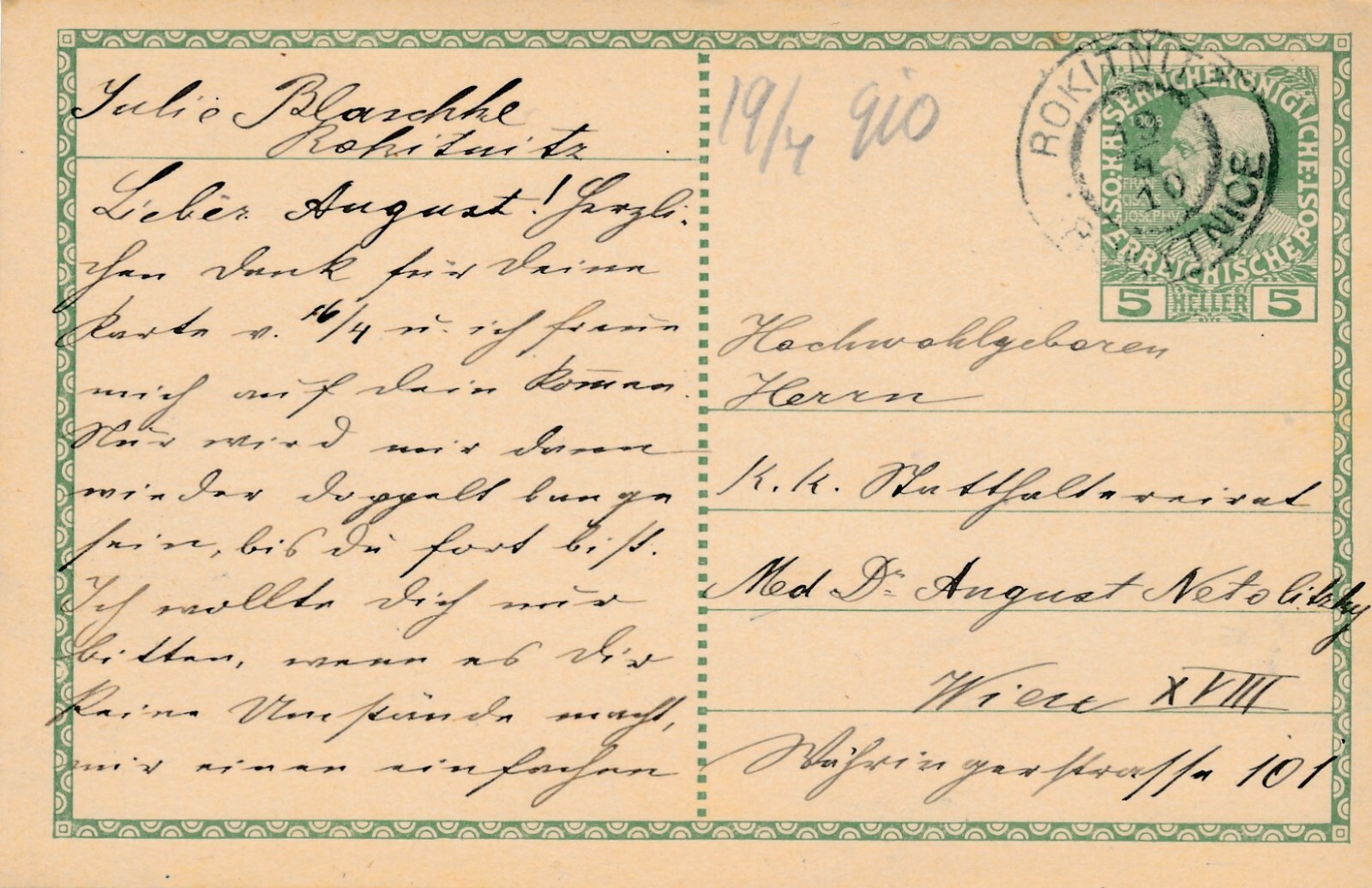 5 Heller - Ganzsachen - Karte 19010 aus Rockitnitz (10652)