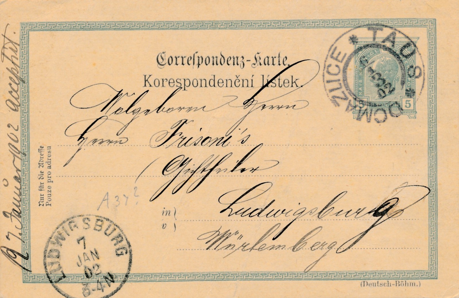 5 Heller - Ganzsachen - Karte 1902 aus Taus Dcmatlice (13368)