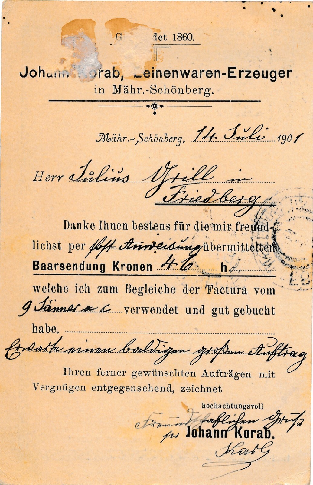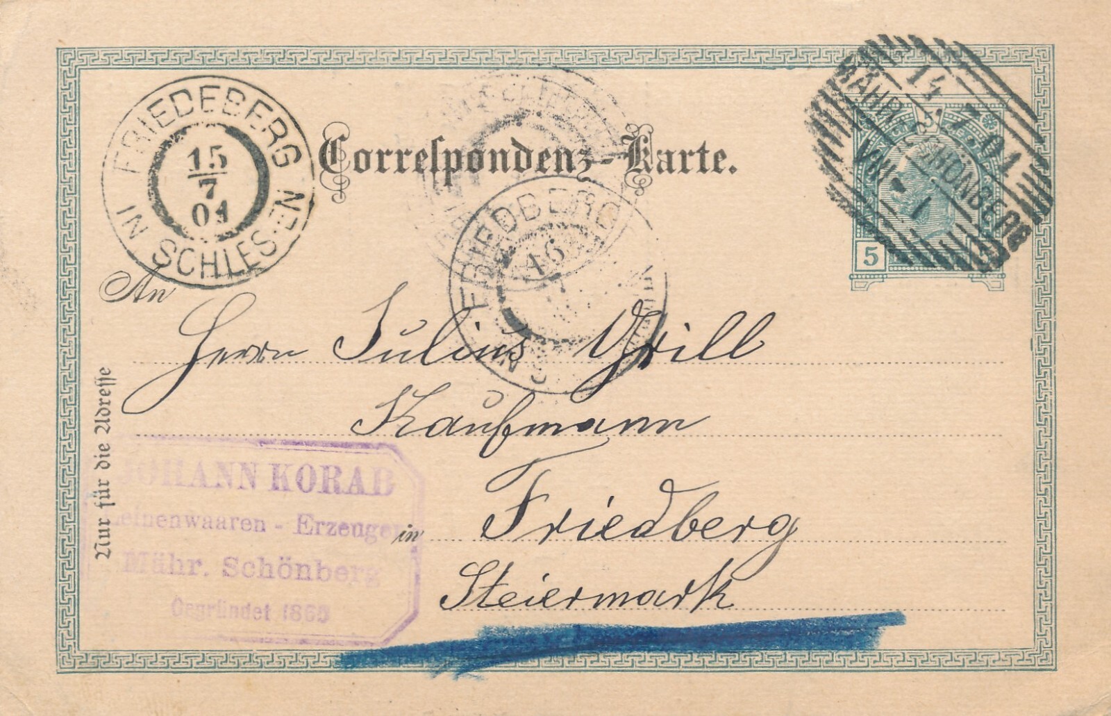 5 Heller Ganzsachen - Karte 1904 aus Mähr Schönberg (8385)