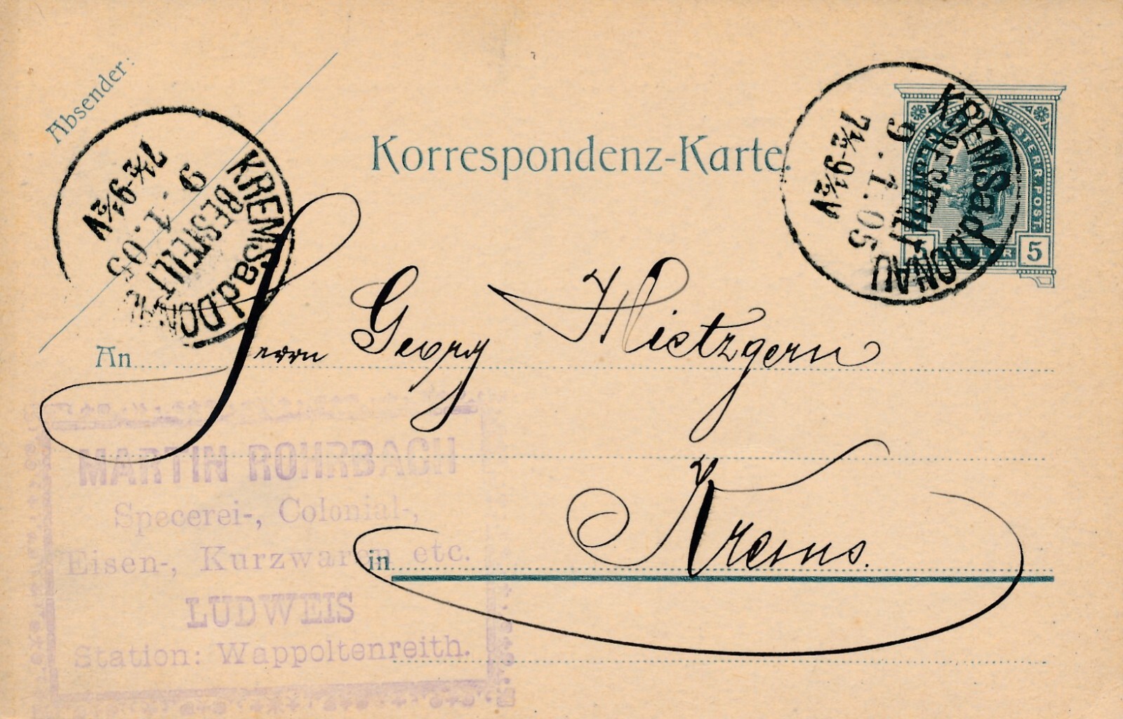 5 Heller Ganzsachen - Karte 1905 aus Krems an der Donau (9979)