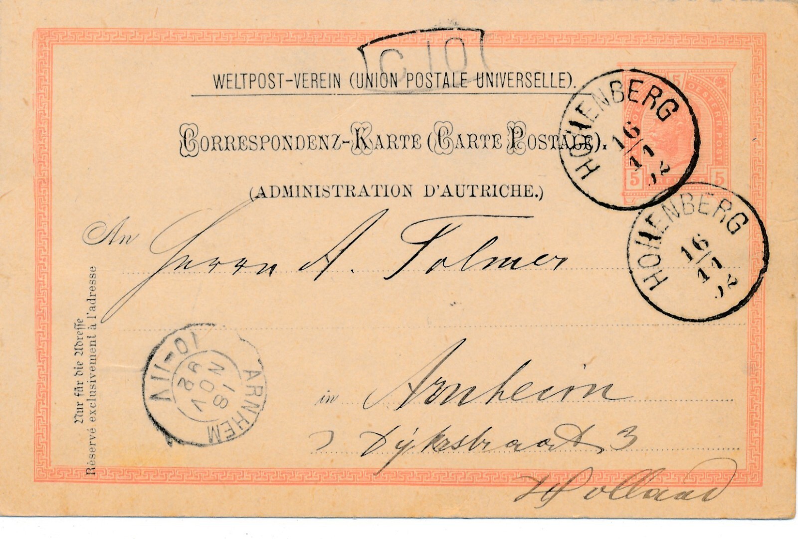 5 Kreuzer Ganzsachen - Karte 1892 aus Hohenberg (11608)