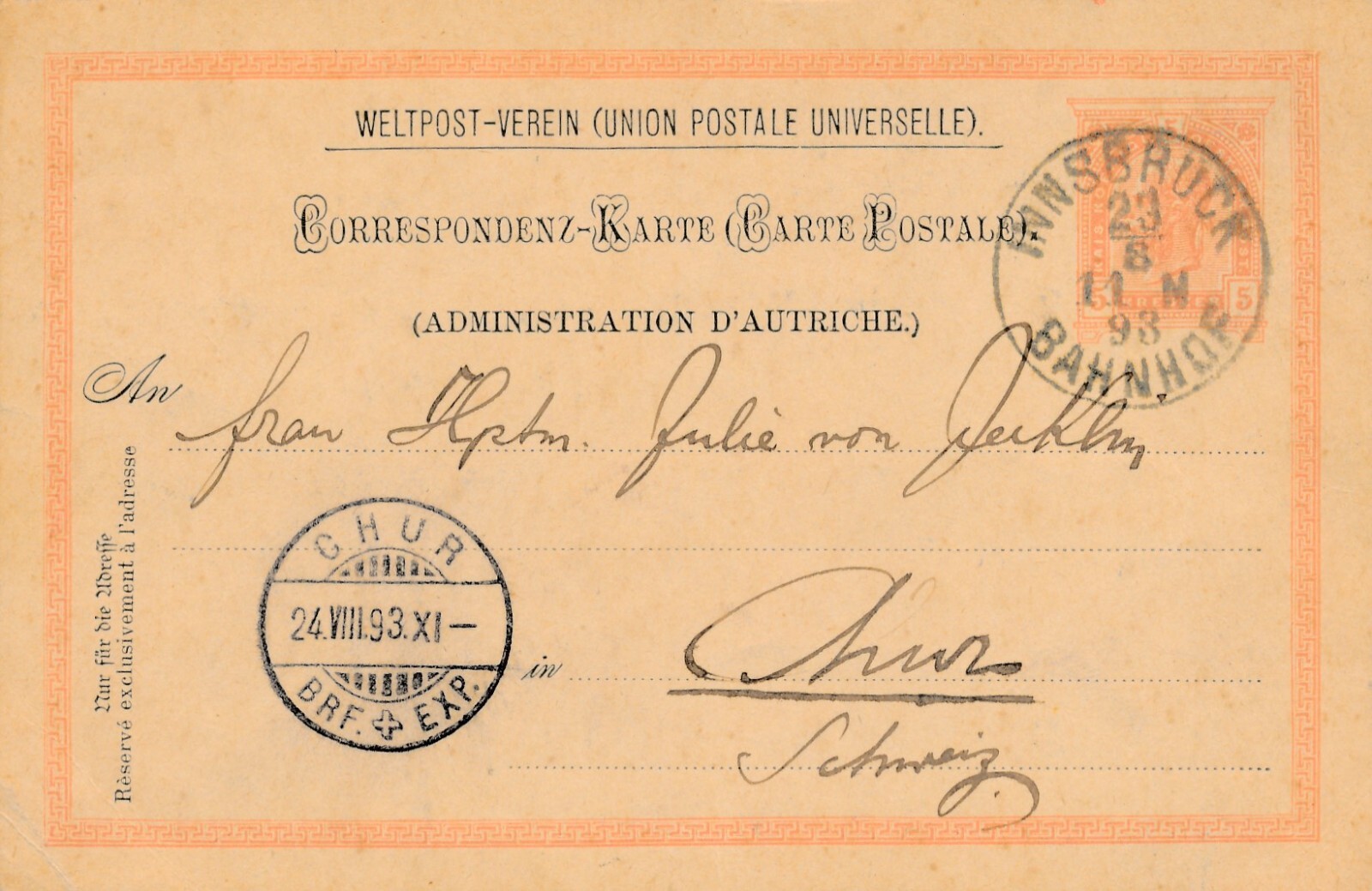 5 Kreuzer Ganzsachen - Karte 1893 aus Innsbruck Bahnhof (11607)