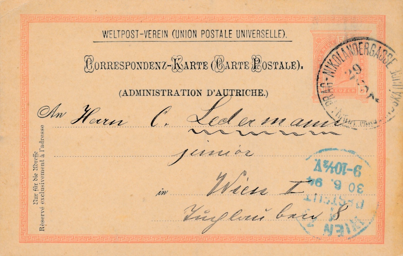 5 Kreuzer Ganzsachen - Karte 1894 aus Prag Nikolandergasse (11392)