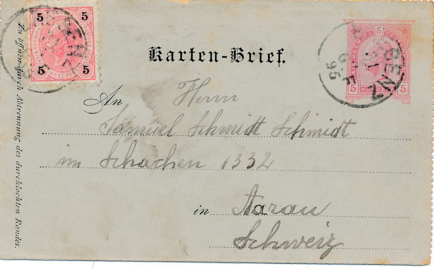 5 Kreuzer - Ganzsachen - Kartebrief 1895 aus Bregenz (11324)