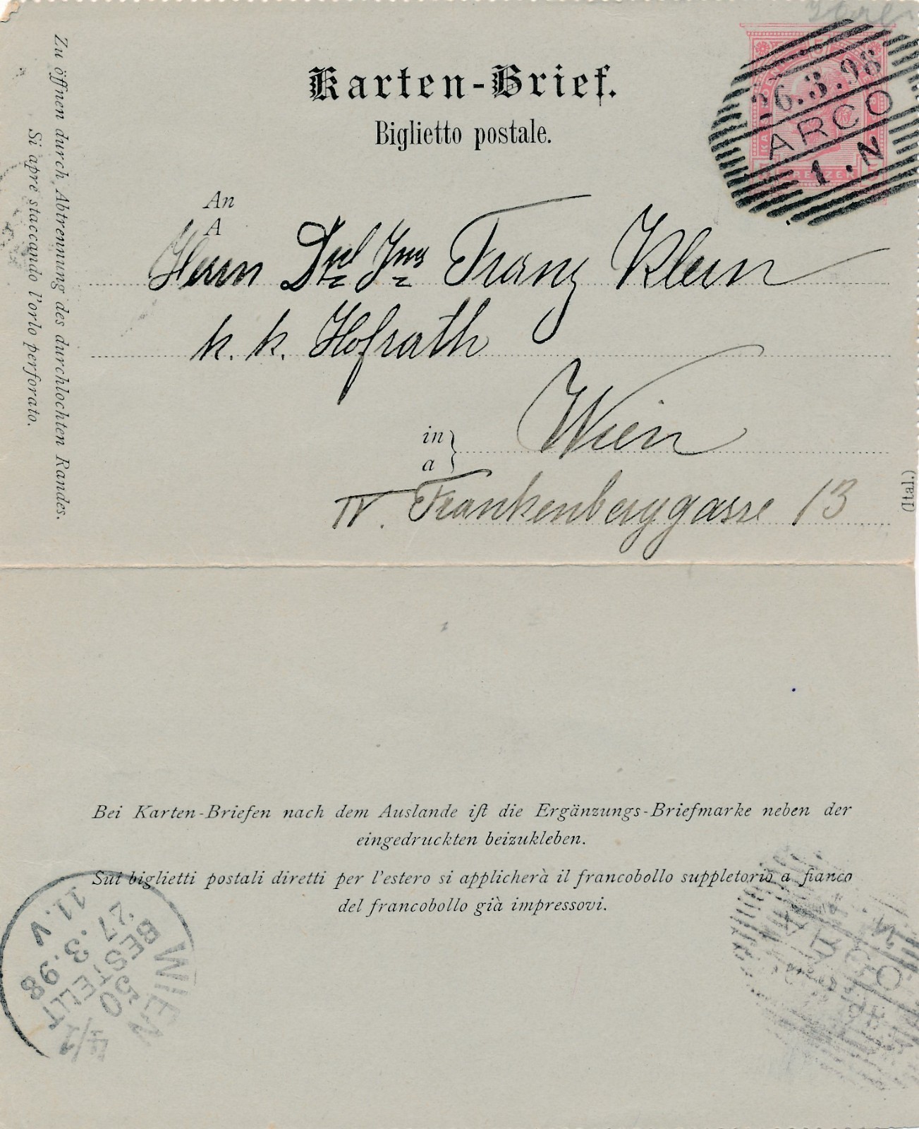 5 Kreuzer Ganzsachen - Kartenbrief - Karte aus Arco (16270)