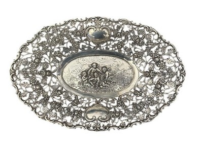 800 Silber Schale Relief Durchbruch Putte Engel Halbmond Krone 324 g 29x19 cm X9