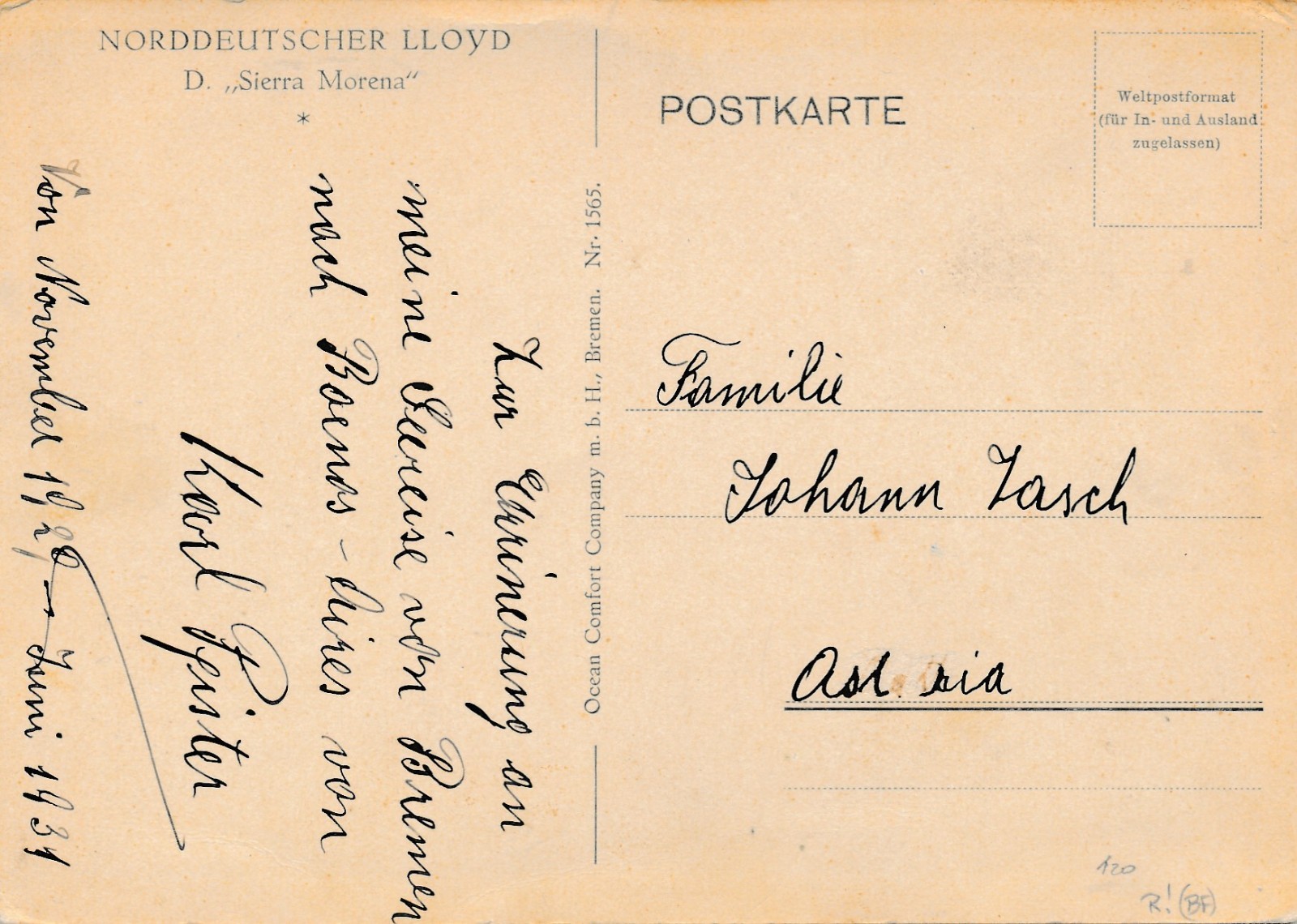 AK aus Norddeutscher LLoyd Sierra Morena Ansichtskarte (18216)