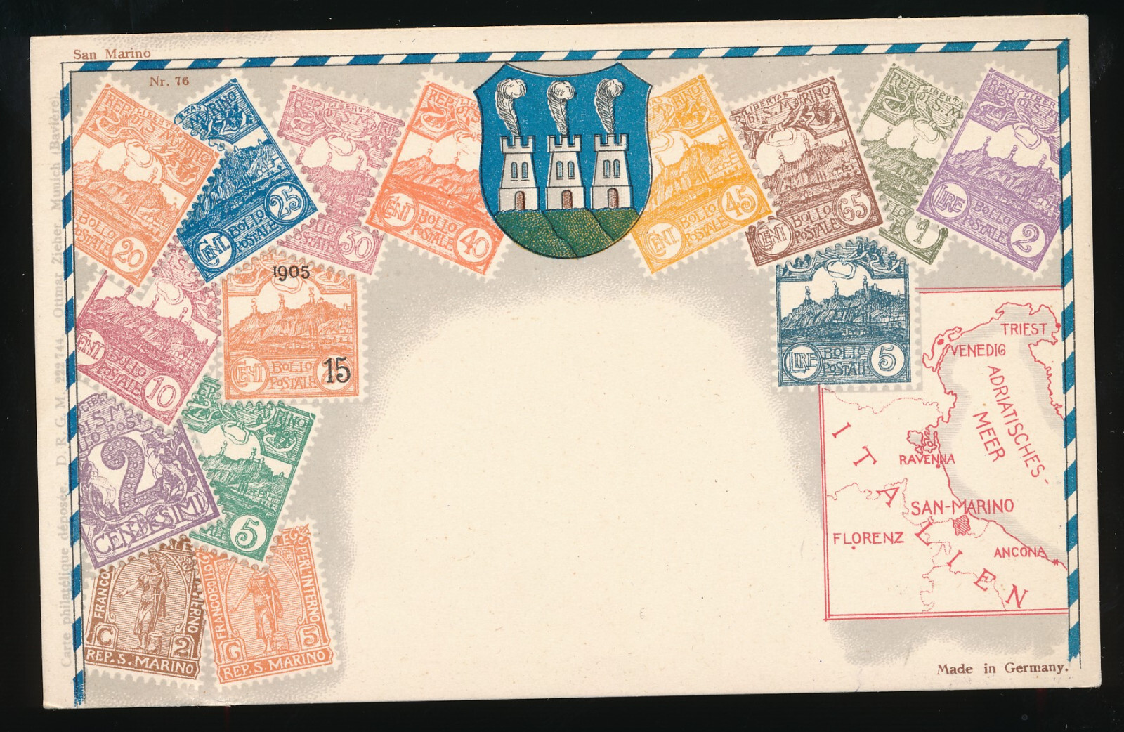 AK aus San Marino Italien mit Wappen und Briefmarken (372)