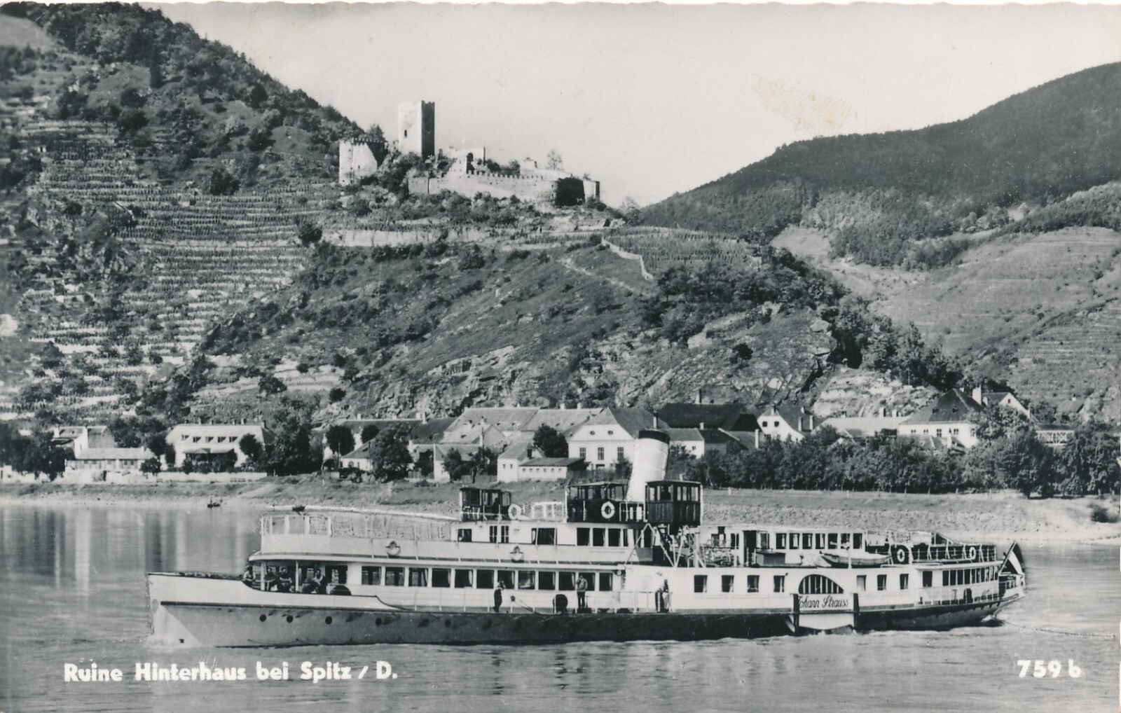 AK aus Spitz mit Ruine Hinterhaus und Dampfer Niederösterreich (6896)