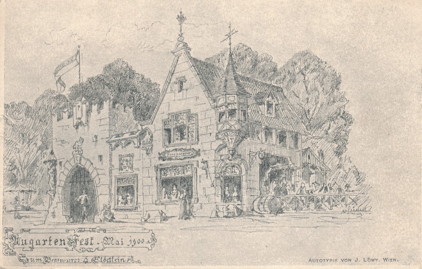 AK aus Wien zum Bratwurst Glöcklein Augartenfest mai 1900 (7555)