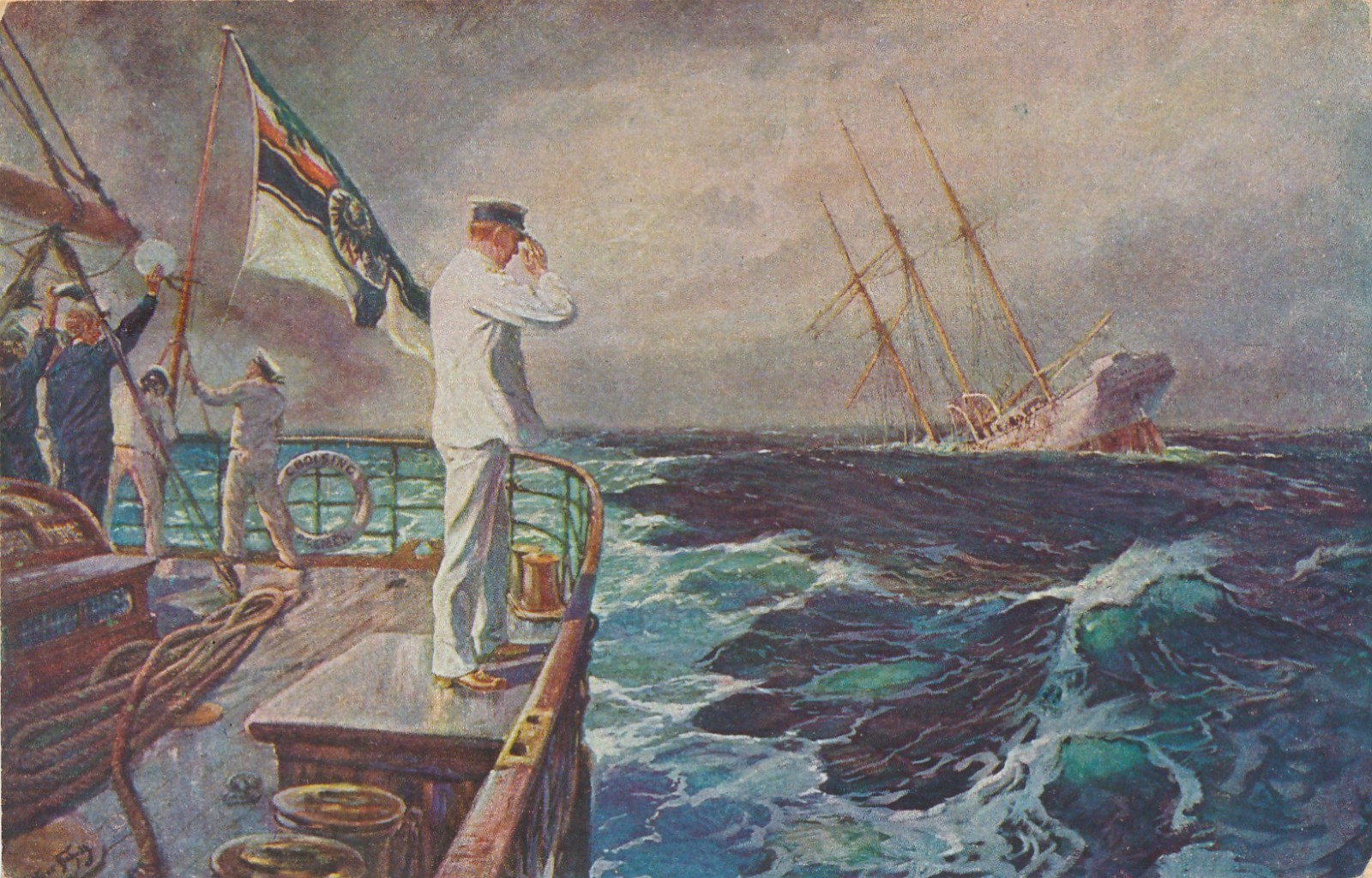 AK der letzte Gruß Soldat Salutiert untergehenden Schiff Ansichtskarte (18127)