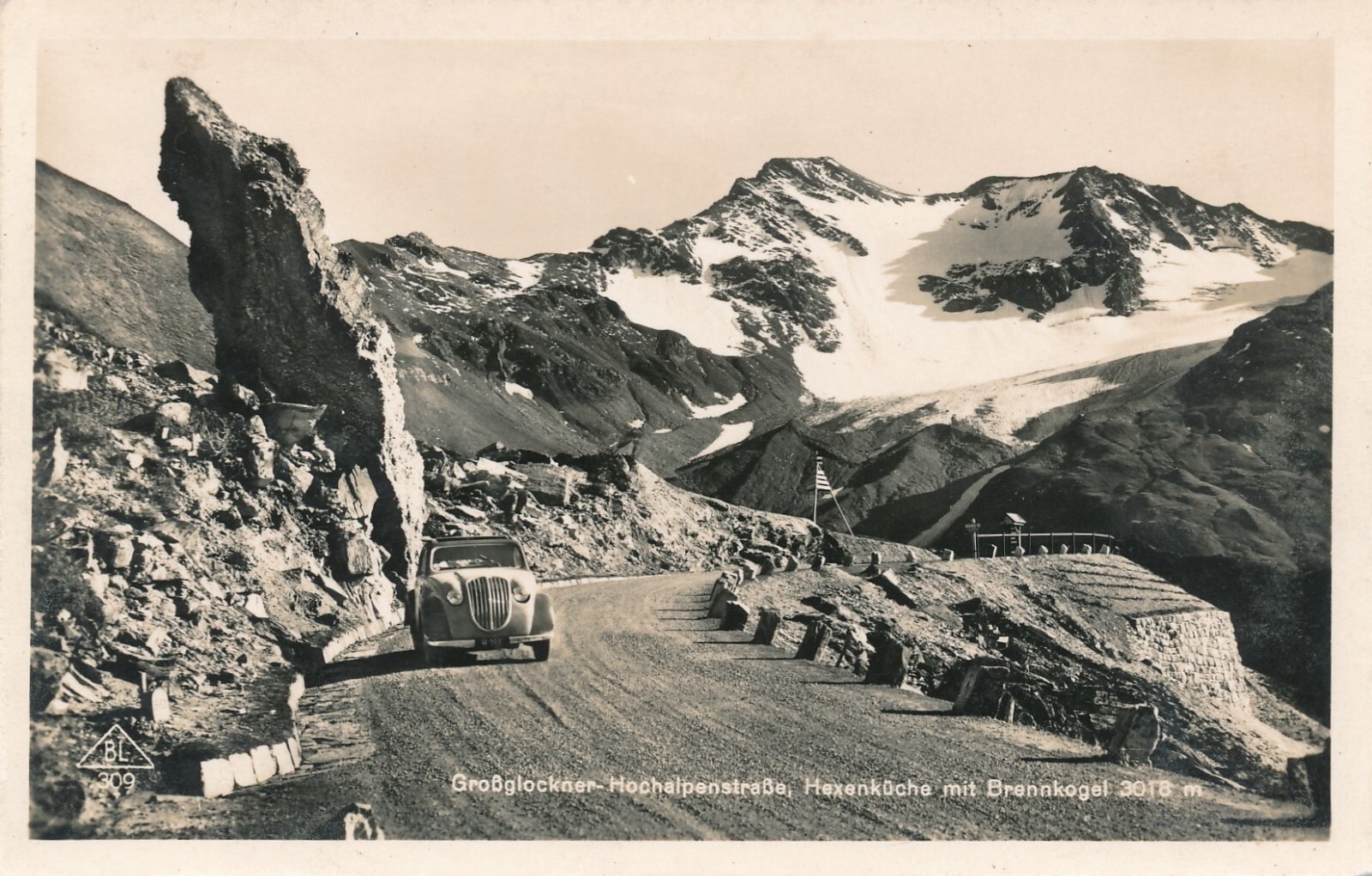 AK, Großglockner Hochalpenstraße, Hexenküche mit Brennkogel und Oldtimer (S94)