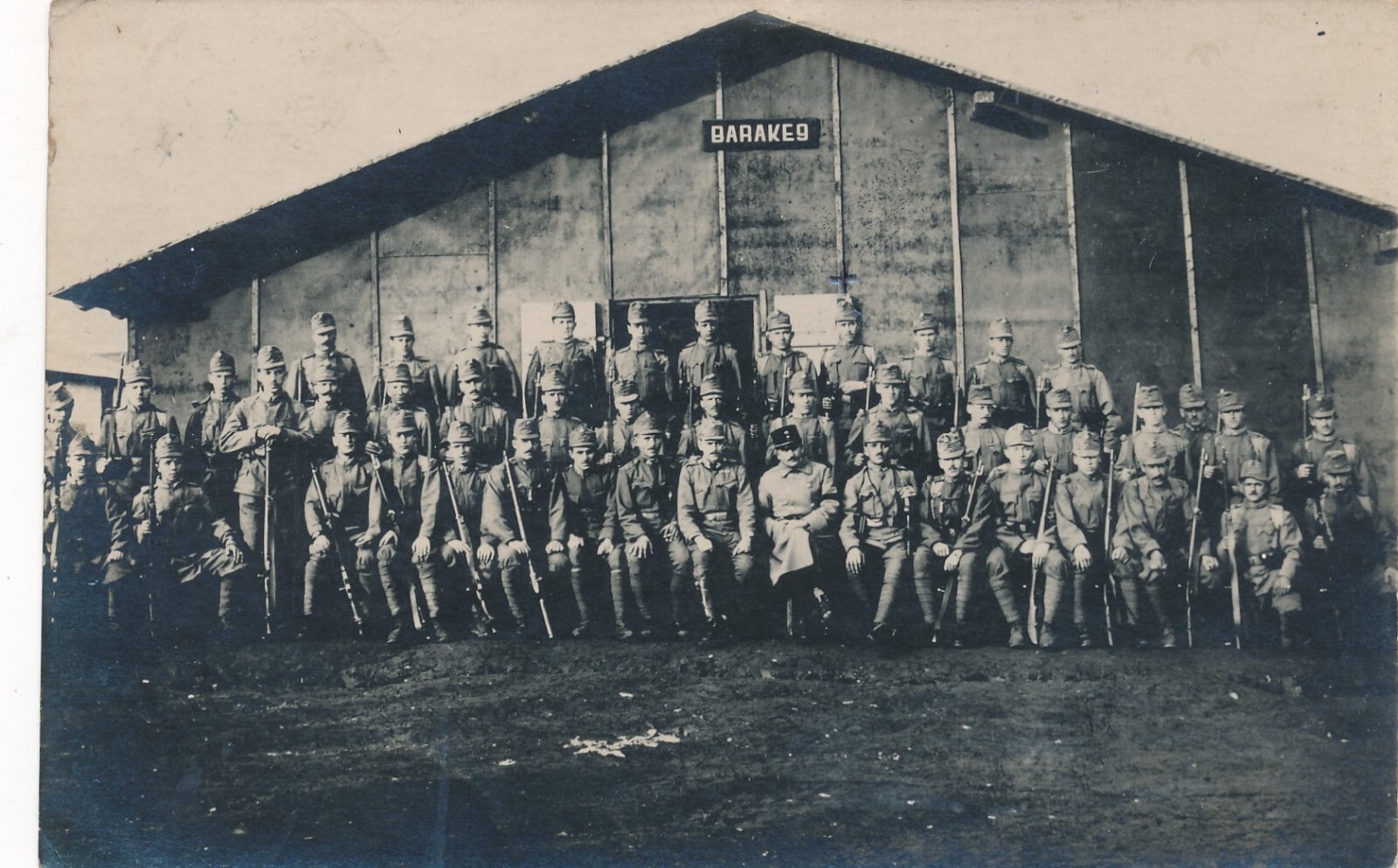 AK Gruppenfotot von der Barake 9 mit Offizier Ansichtskarte (13762)