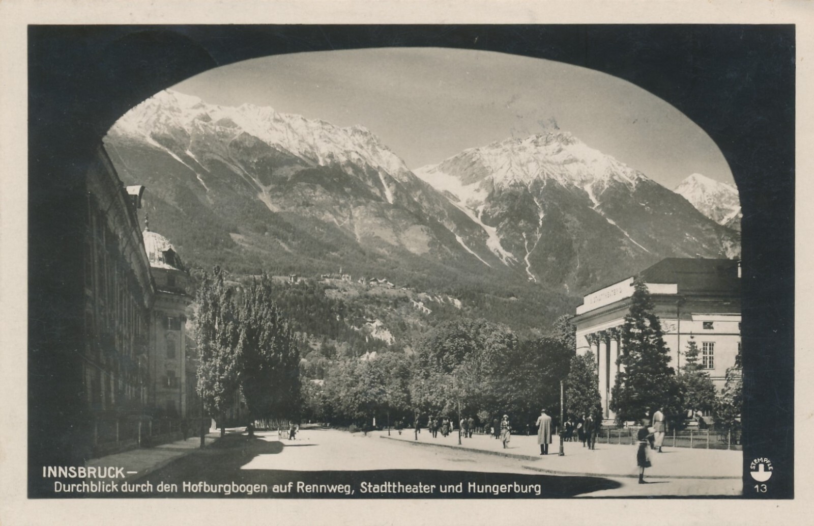 AK, Innsbruck, Durchblick durch den Hofburgbogen auf Rennweg, Hungerburg (S1457)