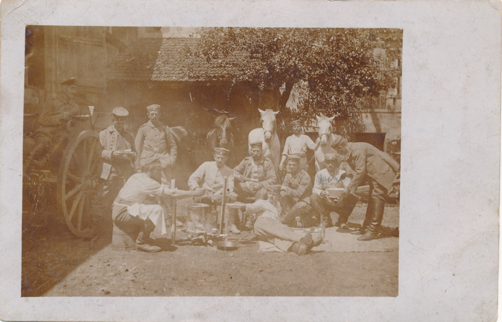 AK Soldaten am Essen Machen mit Pferden Militaria Ansichtskarte (14623)