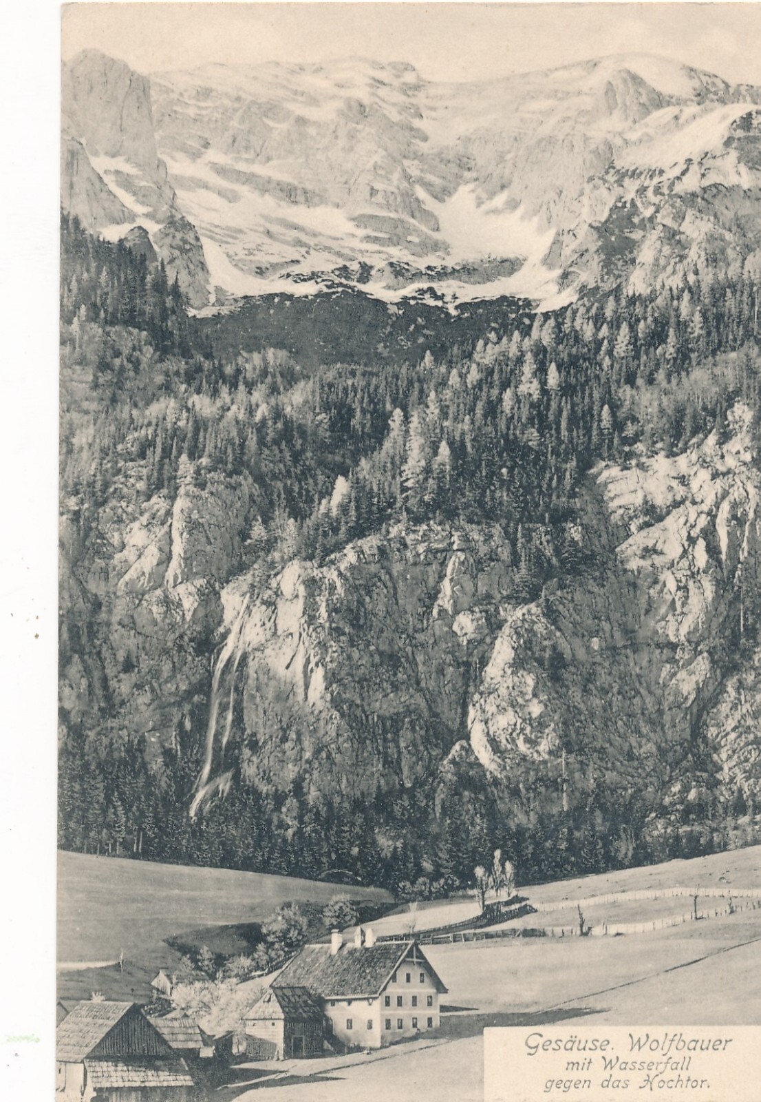 AK vom Gesäuse. Wolfbauer mit Wasserfall Steiermark (8014)