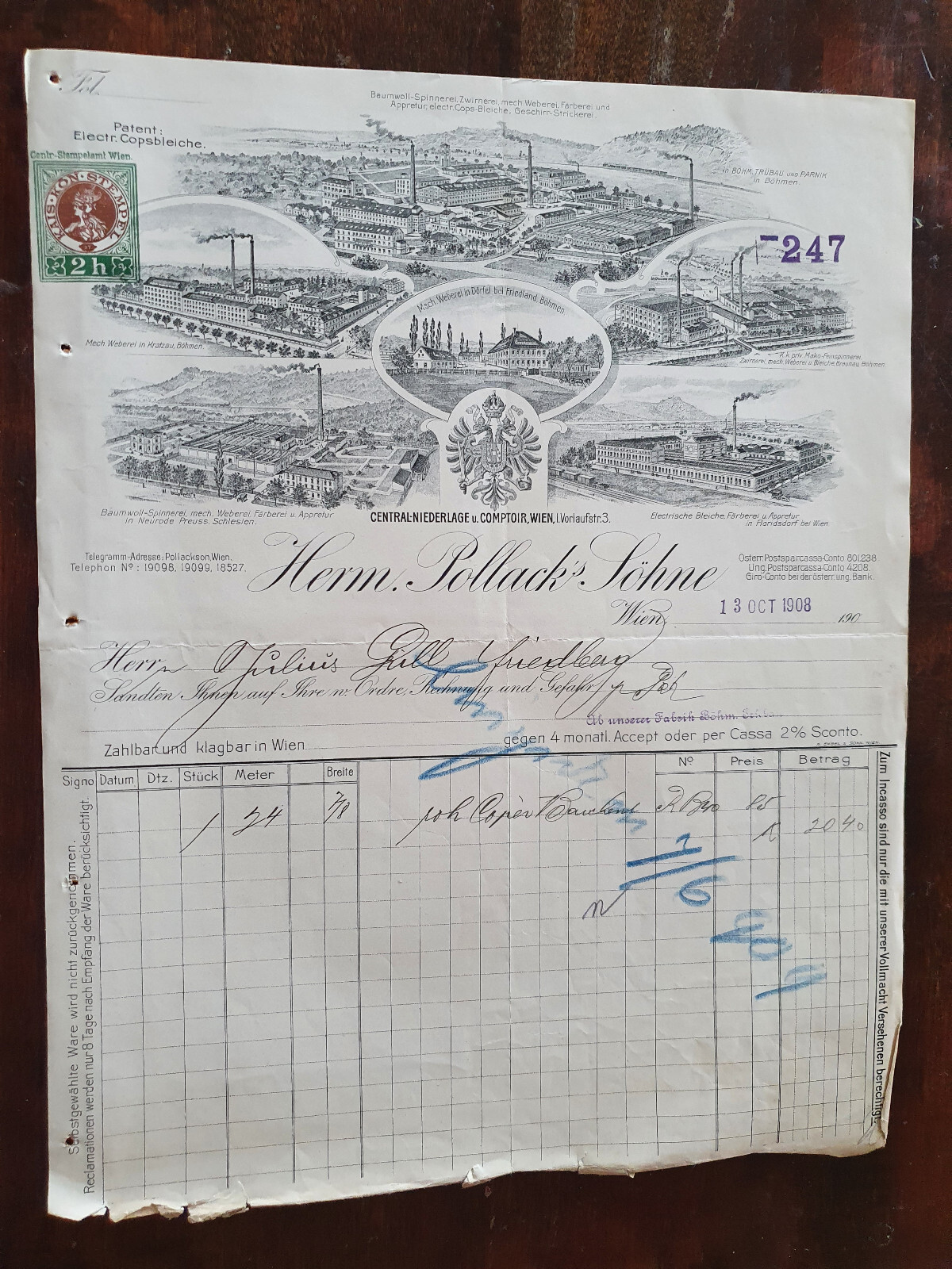 Alte Rehnung 1908 aus Wien Electrische Bleiche und Färberei Herm. Pollack (X4)