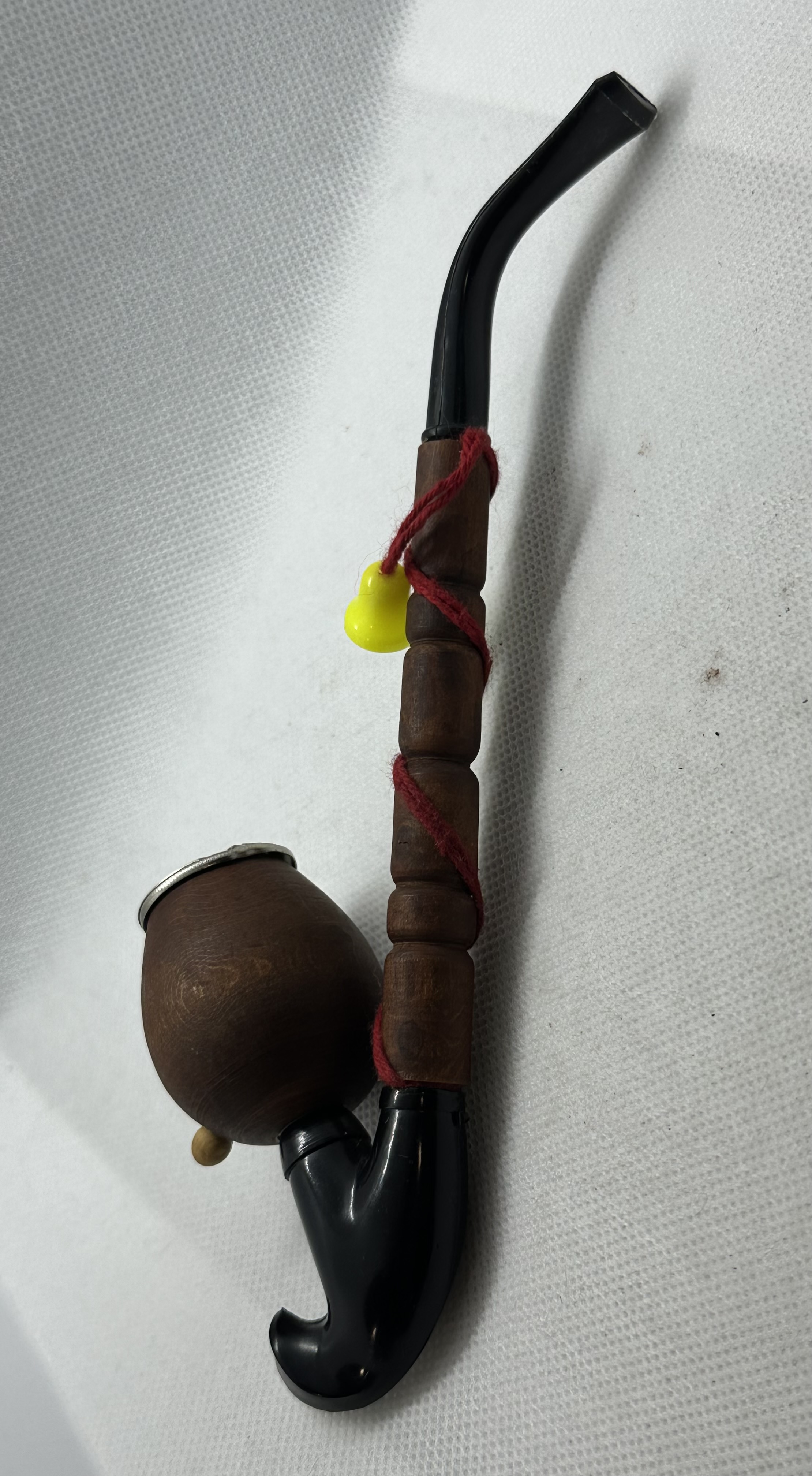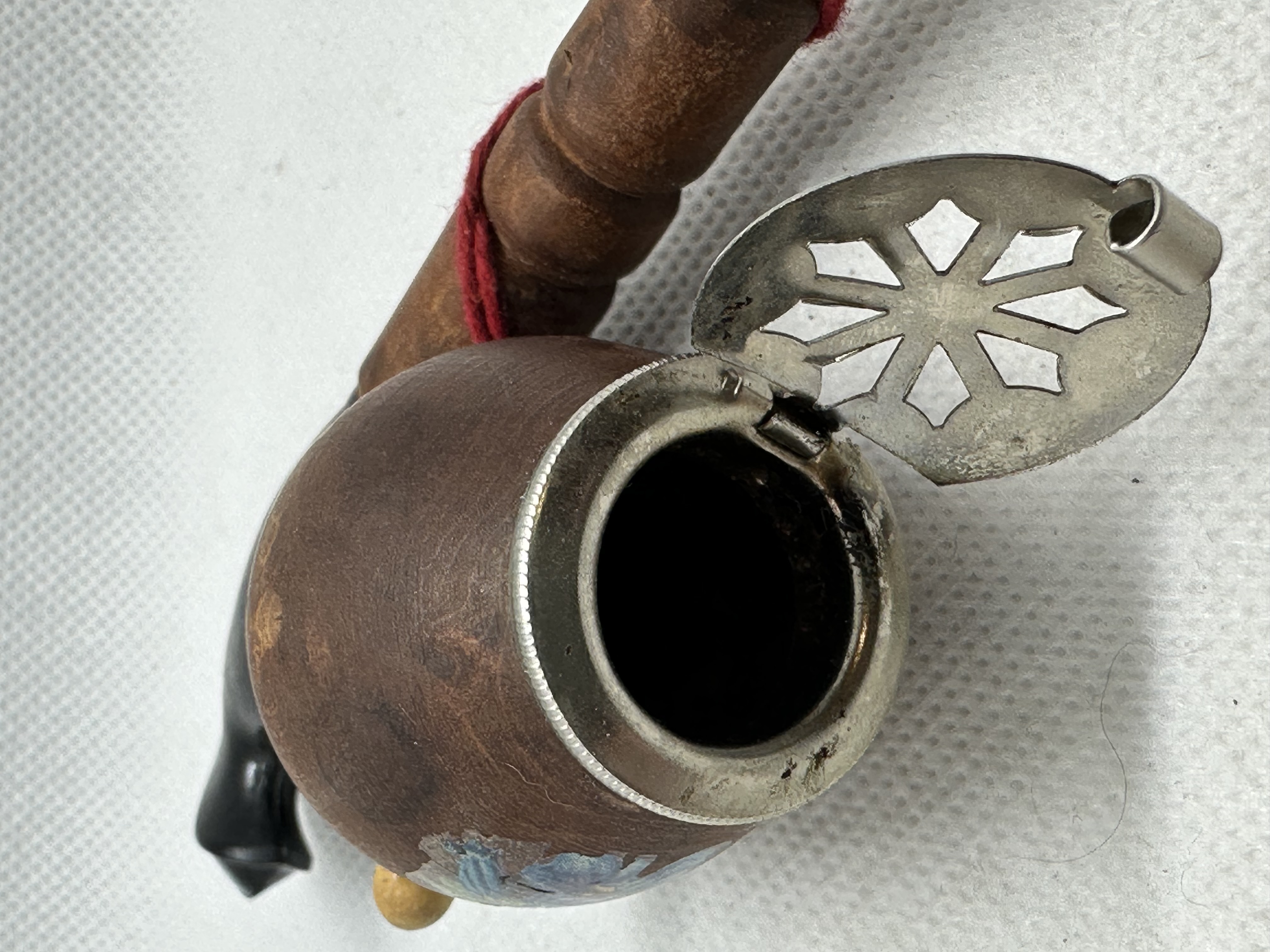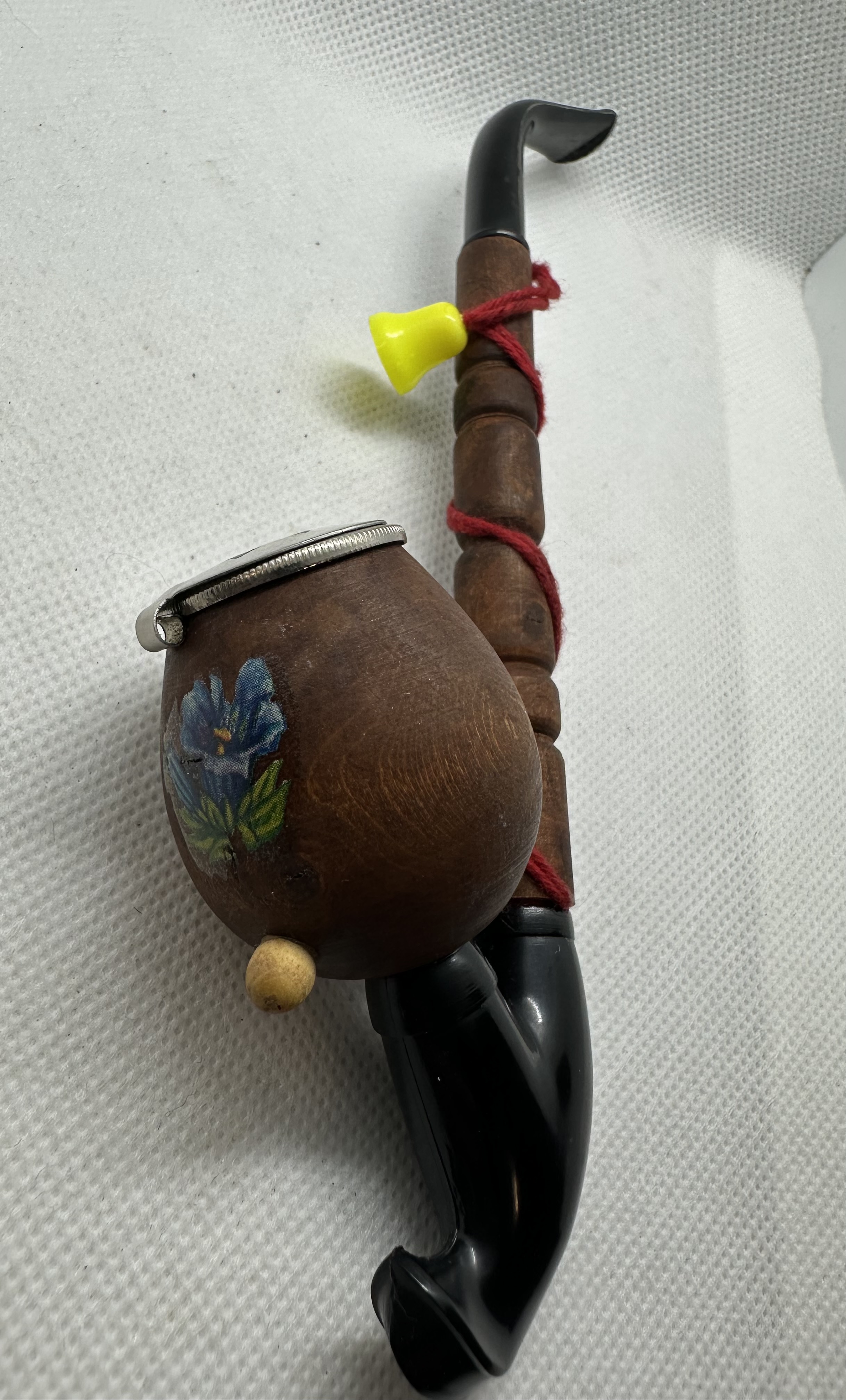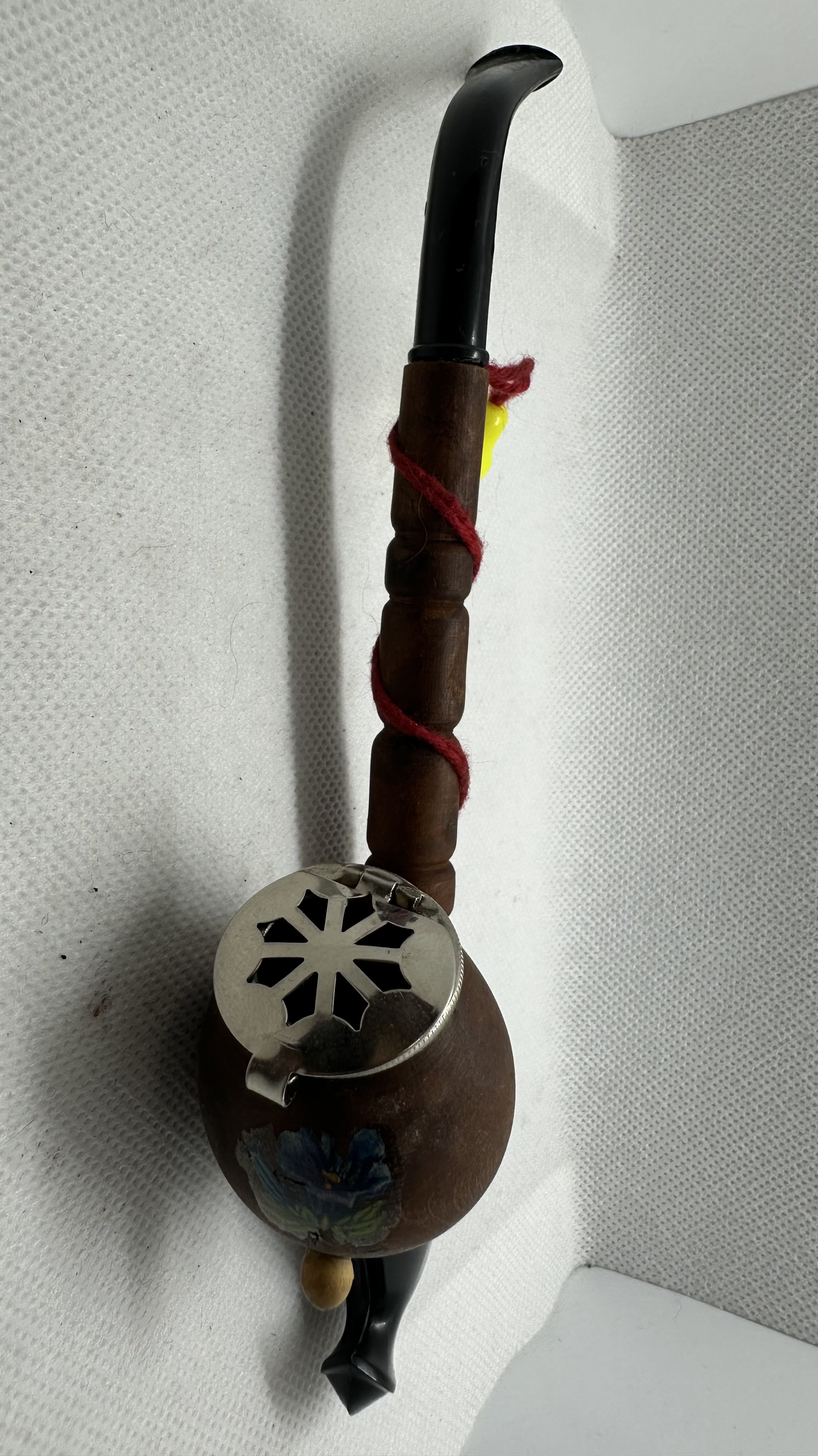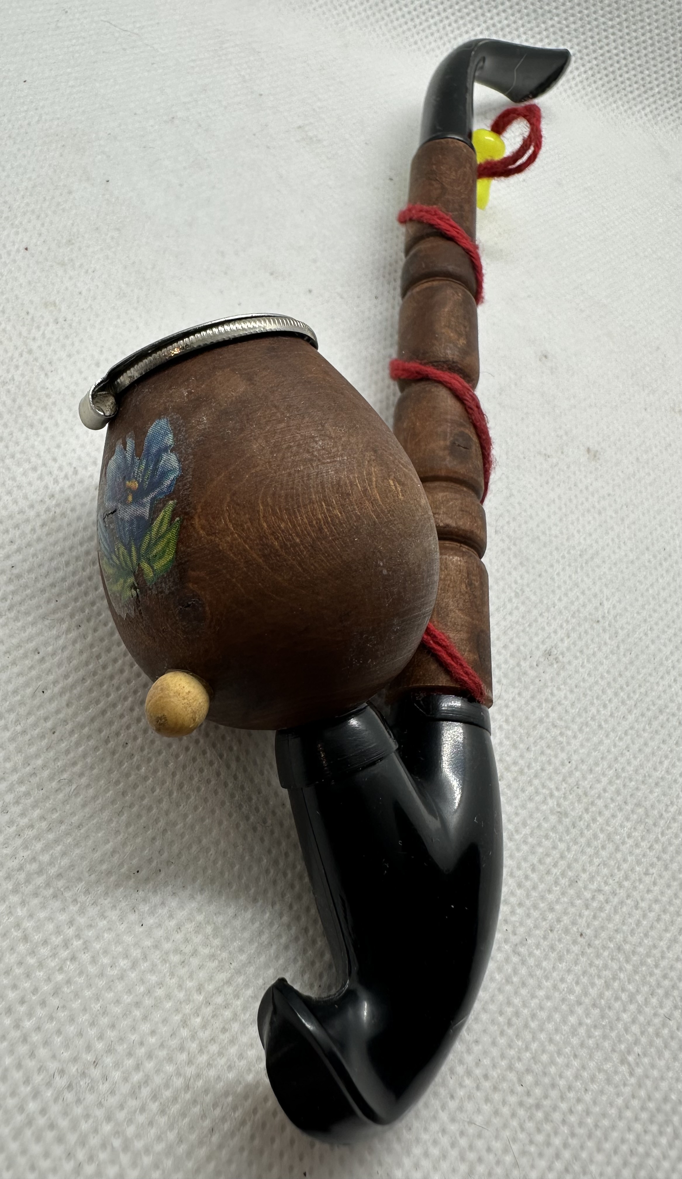 Alte traditionelle Gesteckpfeife, Großvaterpfeife, Pfeifenkopf besteht aus Holz mit handgemalter Verzierung