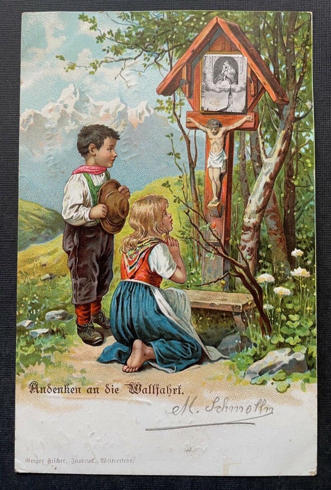 Andenken an die Wallfahrt Kinder Junge Mädchen Bildstock Kreuz Tracht 410798 A