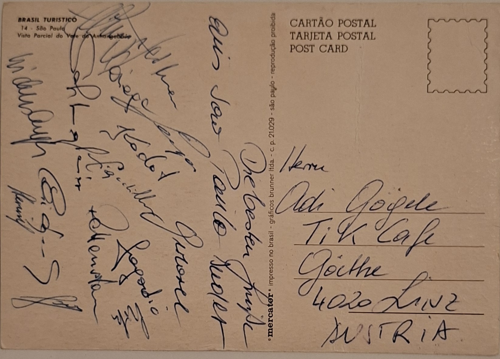 Ansichtskarte aus Sao Paulo in Brasilien mit Unterschriften der ÖFB Fußball-Nationalmannschaft 1971 anlässlich des Freundschaftsspieles Brasilien gegen Österreich am 11.07.1971.