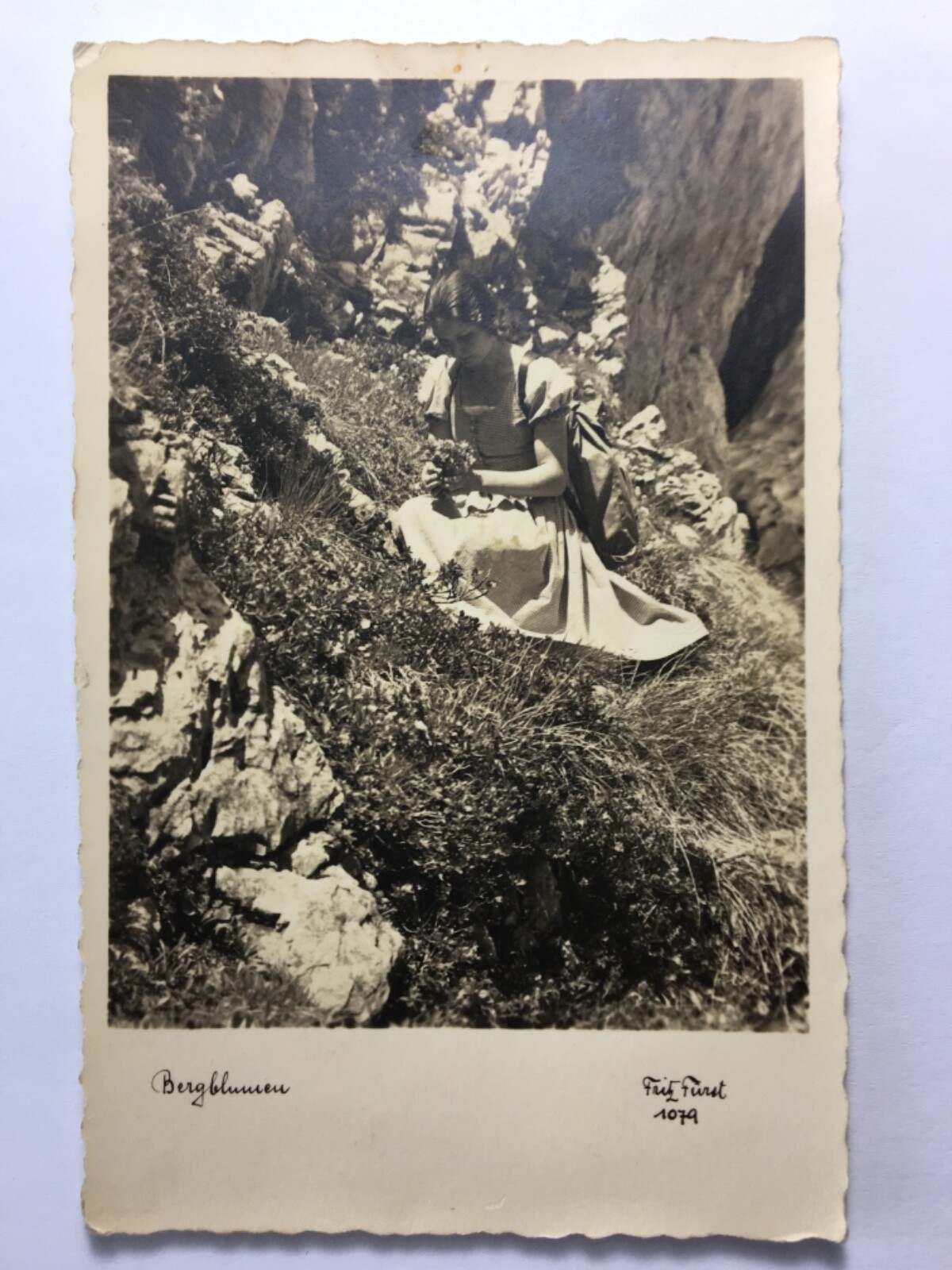 Bergblumen (F.Fürst) - Mädchen beim Blumenpflücken - Künstlerkarte 20101 TH