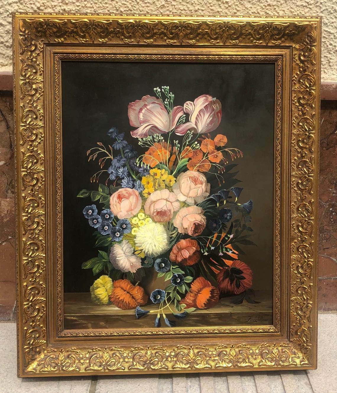 Blumen Stilleben sign. F. Wallner Öl auf Platte gerahmt 65 x 55 cm 42024