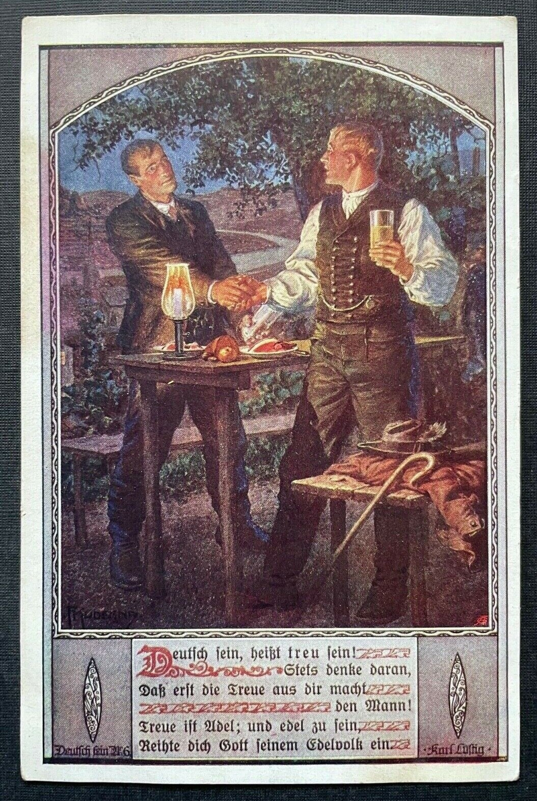 Deutscher Schulverein Treue Spruch Handschlag Mann Tracht Stock Glas 400331 TH A