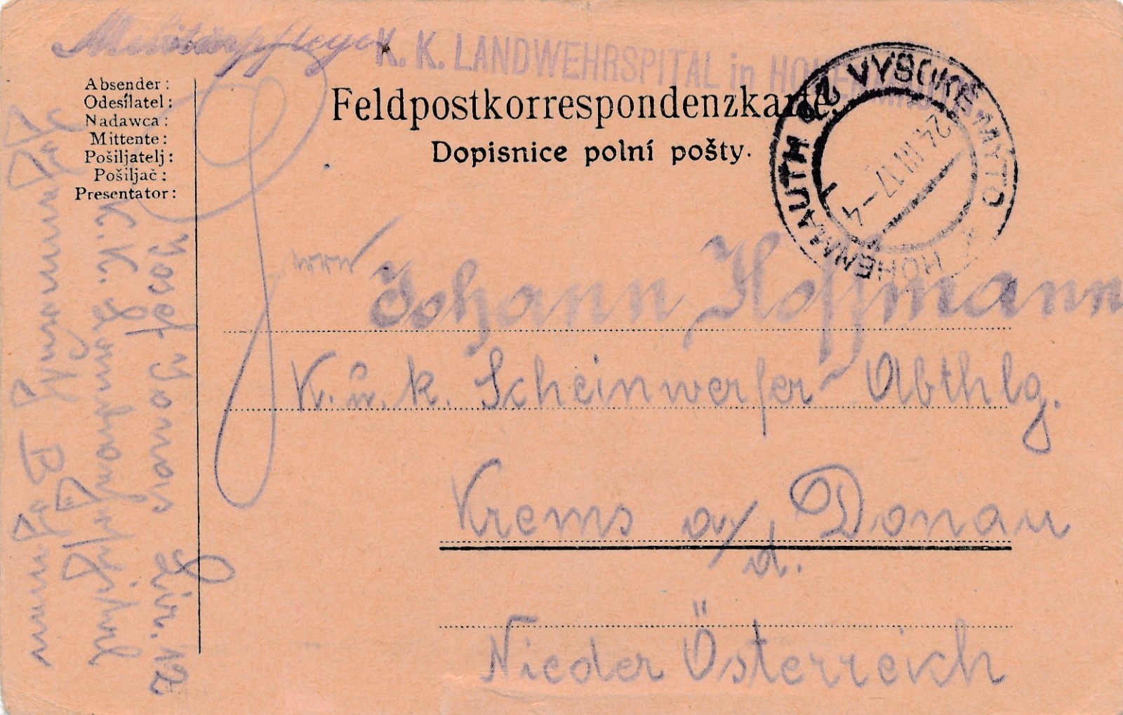 Feldpost - Karte K.K Landwehrspital in Hohenmaut (16941)