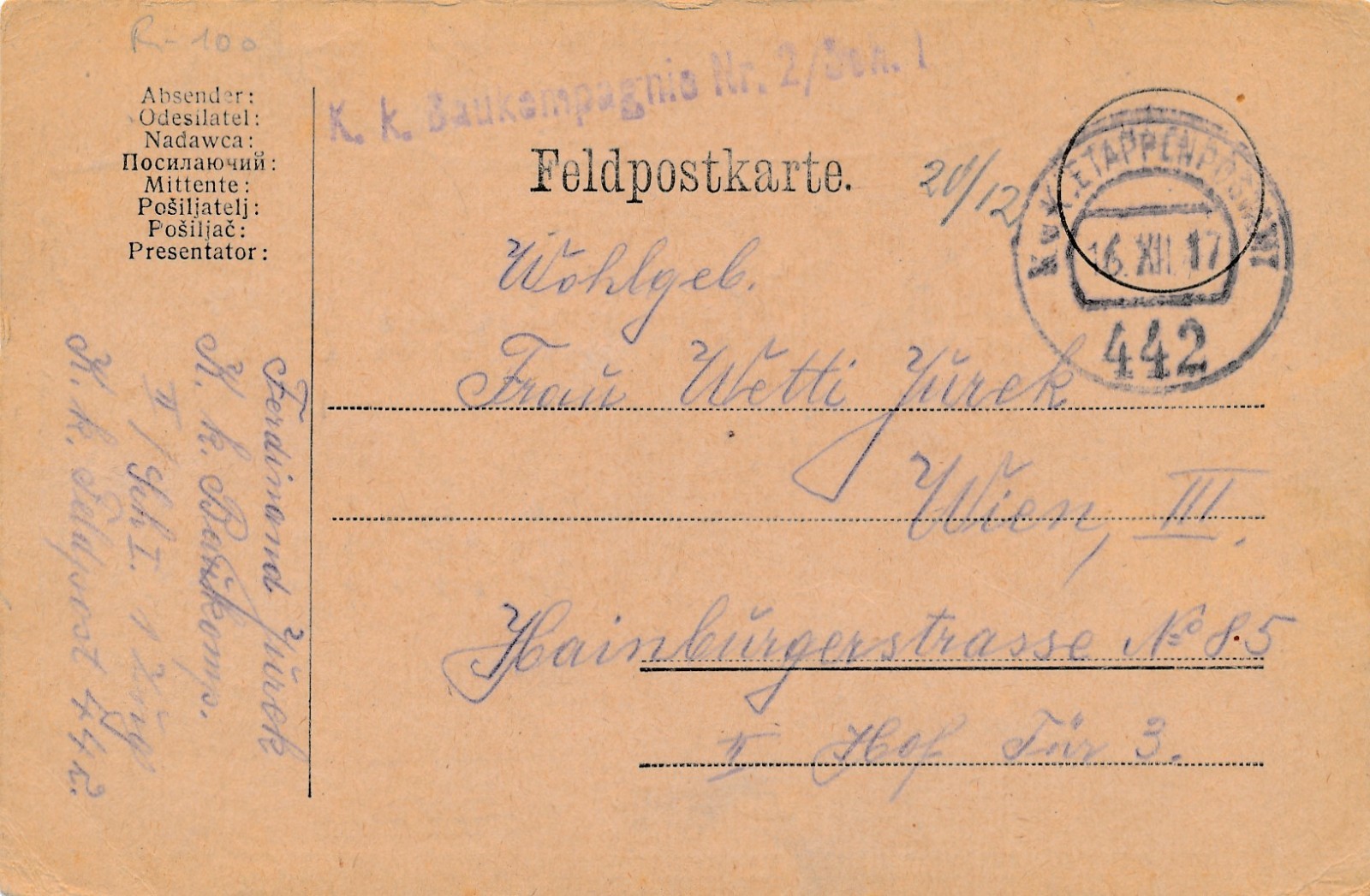 Feldpoststempel 234 K.u.K. Inf. Reg Nr. 14 2/XXV Marschkomp. Blaudruck (14939)
