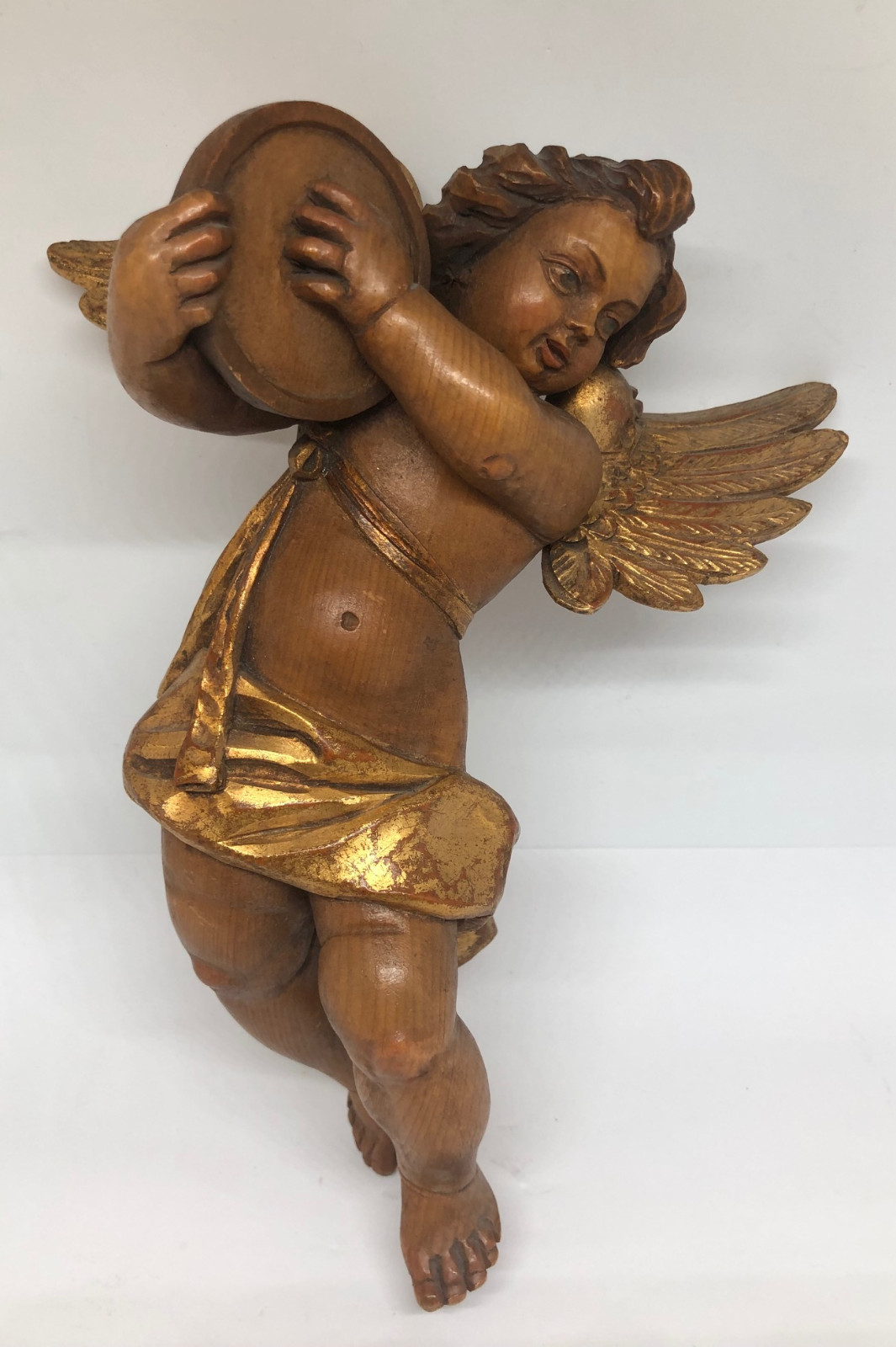 Holzengel Musikinstrument Trommel ca. 30 cm Blattgold um 1950 oder früher 25447