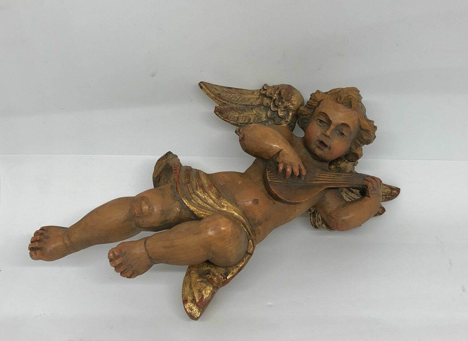 Holzengel Musikinstrument um 1950 oder früher Blattgold ca. 22 cm 25433