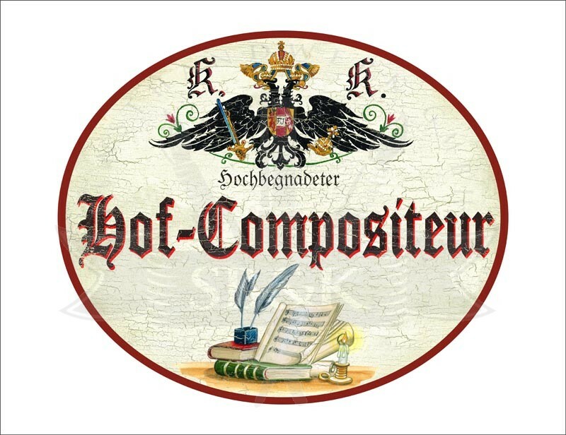 KuK Nostalgie Holzschild - Hochbegnadeter Hof-Compositeur - Bücher Feder TH