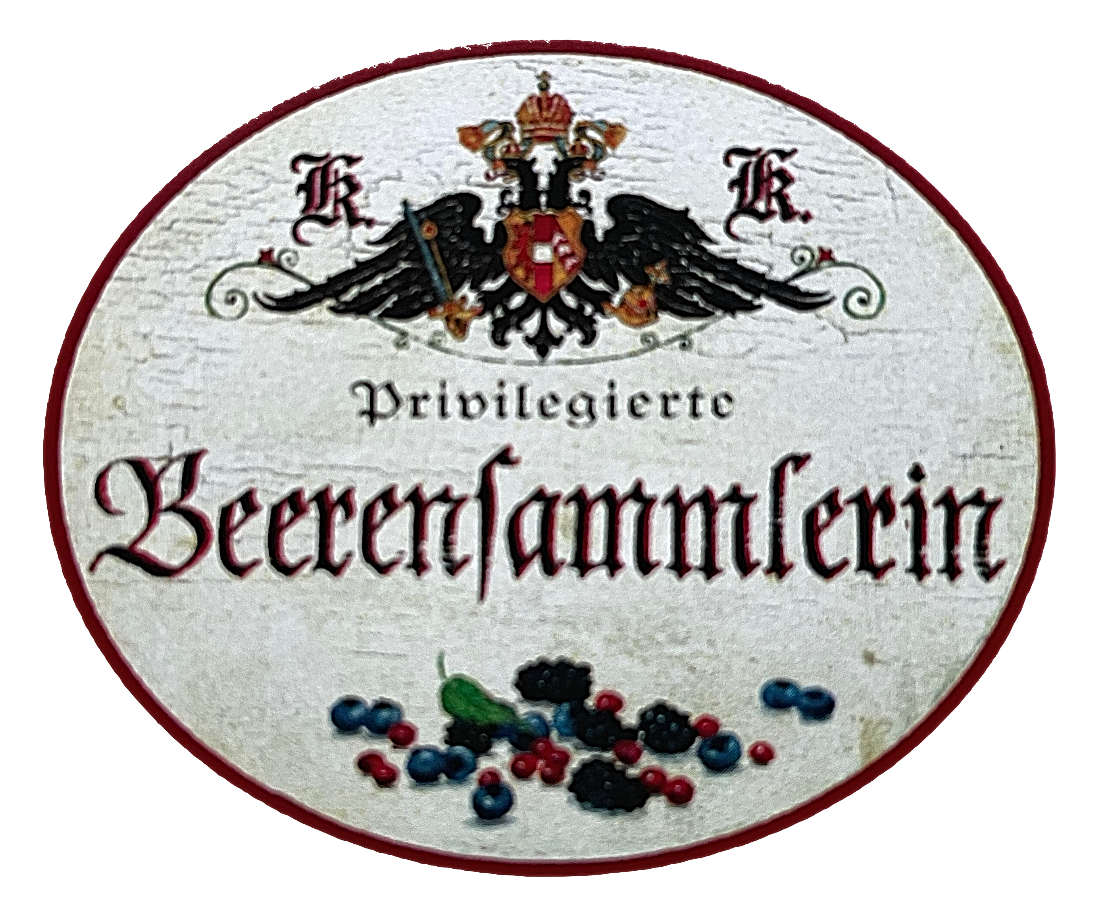 KuK Nostalgie Holzschild "Privilegierte Beerensammlerin" Waldbeeren Blatt
