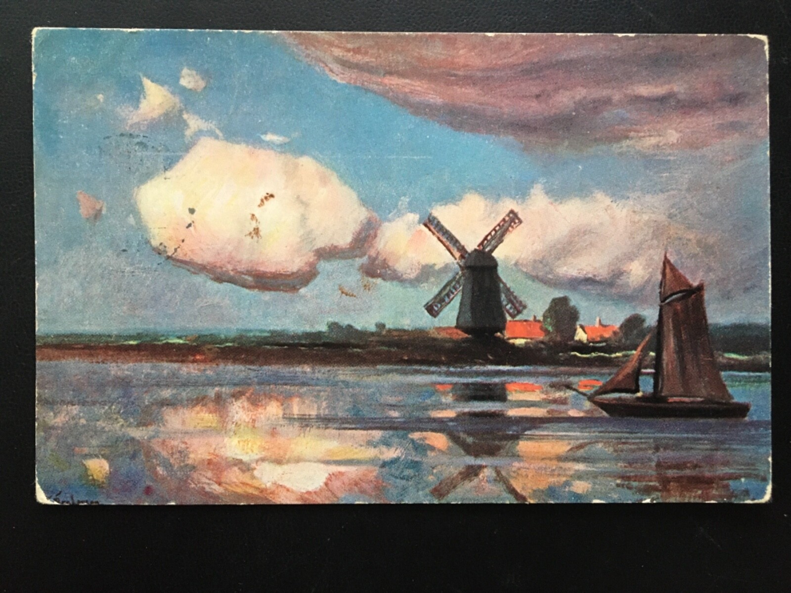 Küste mit Windmühle - Segelschiff - Strand Wolken - Künstlerkarte 908 TH