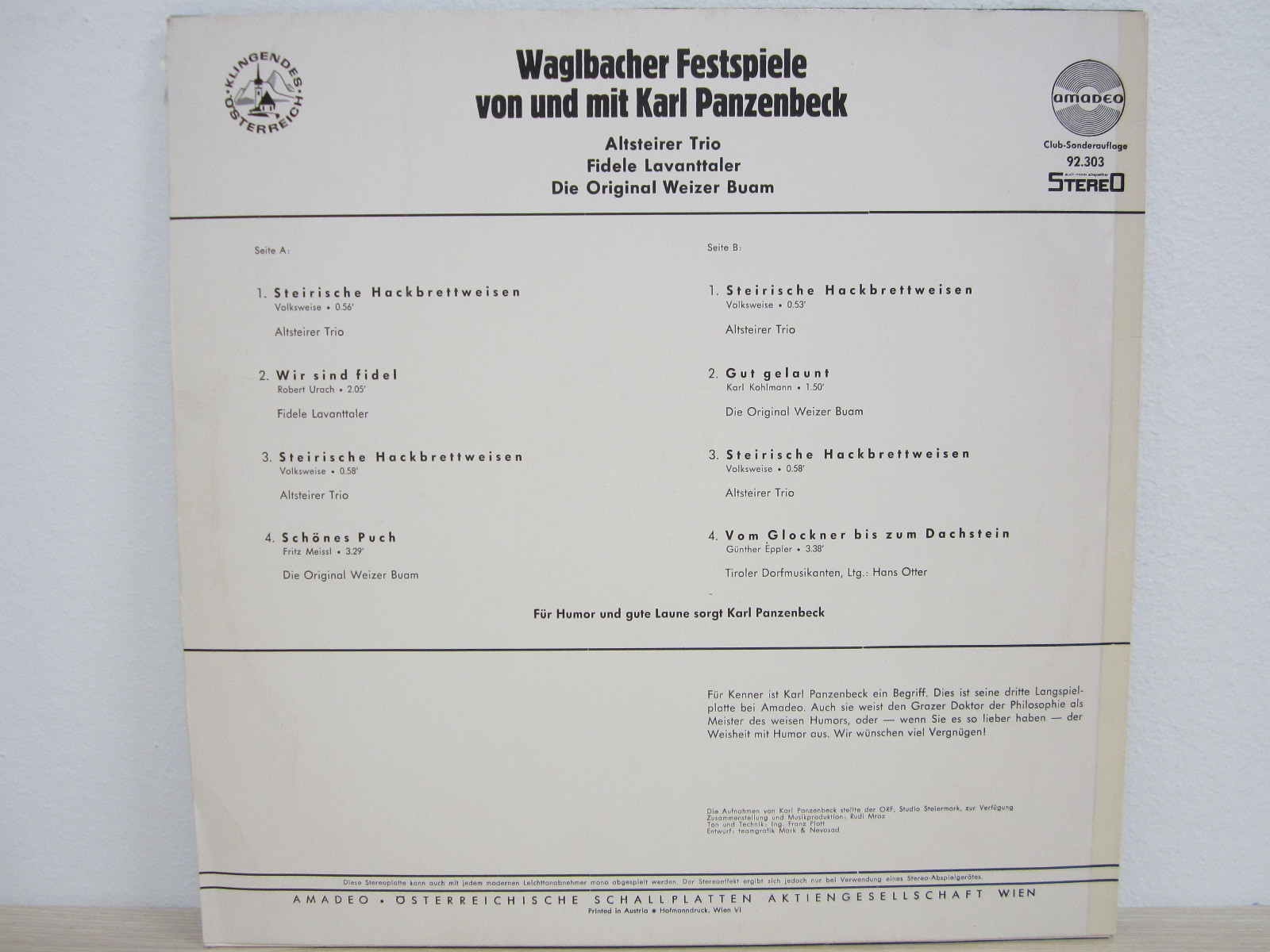 LP / KARL PANZENBECK / AUSTRIA / RARITÄT / CLUB-AUFLAGE / AMADEO /