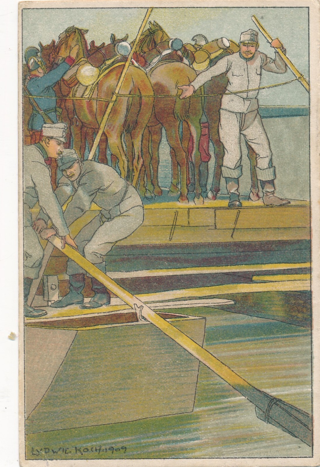 Ludwig Koch Karte Soldaten bei der Überfuhr mit Pferden Ansichtskarte (13710)