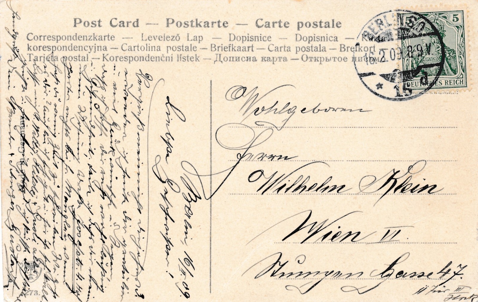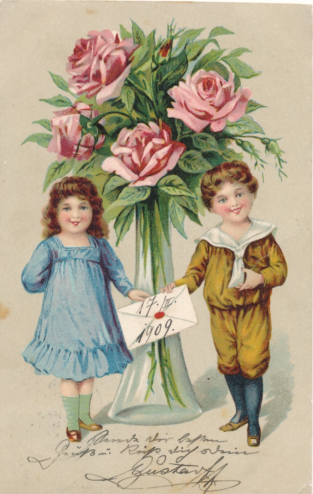 Motiv - Karte Mädchen und Junge mit Brief vor Riesen Blumen (10761)