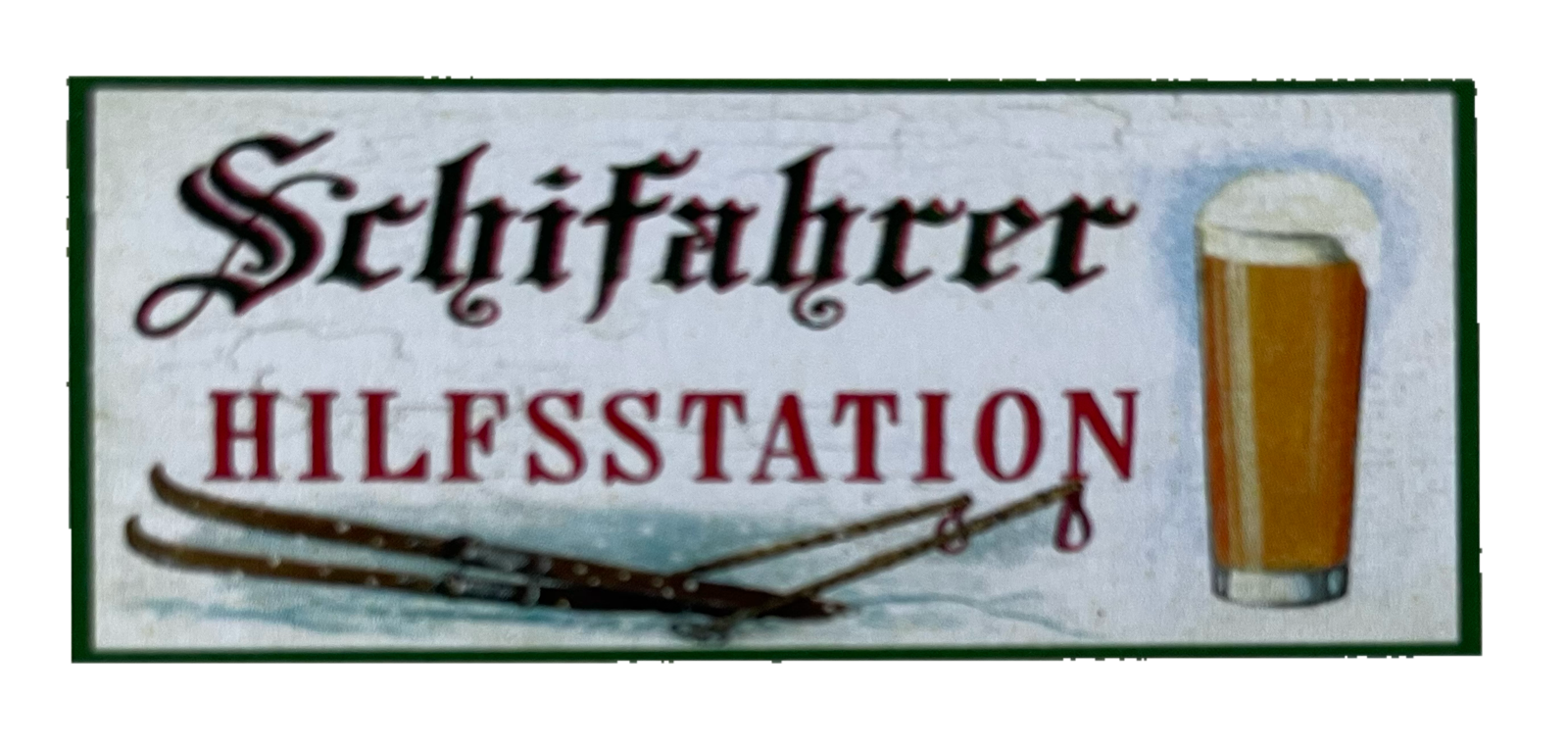 Nostalgie Holzschild Schifahrer Hilfsstation Jause Pause Alkohol Bier Schild