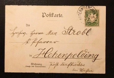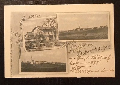 Wunderbare Jugendstil-Mehrbildkarte um 1900 aus Ostermünchen (Oberbayern): drei fein gerahmte Ansichten des ländlichen Ortes – Bauernhäuser, Höfe und die charakteristische Dorfkirche auf sanfter Anhöhe. Zarte florale Verzierungen, elegante Typografie „Gruss aus Ostermünchen“. Rückseitig sauber adressiert nach Hohenpolding, frankiert mit 5-Pfennig Bayern. Ein seltenes, ausgesprochen dekoratives Stück oberbayerischer Ortsgeschichte in schöner Erhaltung.